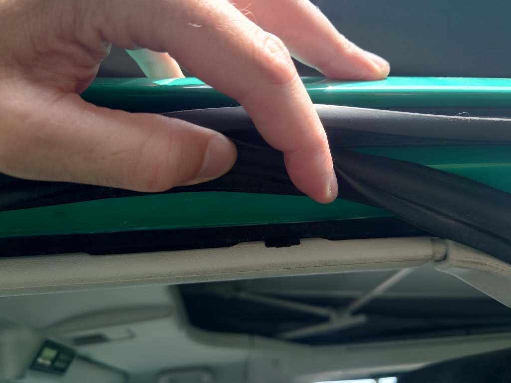 Ik probeer de a-stijl van mijn California te verwijderen, aan de hand van https://www.t4-wiki.de/wiki/Verkleidung. Als ik het goed begrijp moet ik binnen zittend de bekleding onderaan aan de buitenkant vastgrijpen en recht omlaag trekken. Maar het lijkt of ik niet genoeg grip heb, de boel komt met geen mogelijkheid los, en ik heb inmiddels al een blaar op een vingertop.