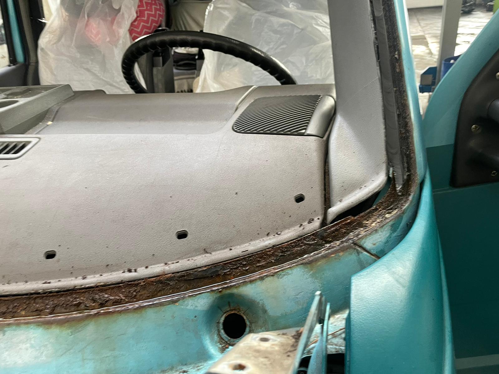 Vorig jaar onze ruit laten doen bij een erkende T4 specialist. Was slechts een beetje roest te zien, daar was al stevig herstelwerk nodig. Als ik dit zo zie, moet je echt stevig laswerk gaan incalculeren. Zou niet zelf gaan hobbyen tenzij je professioneel kan lassen..