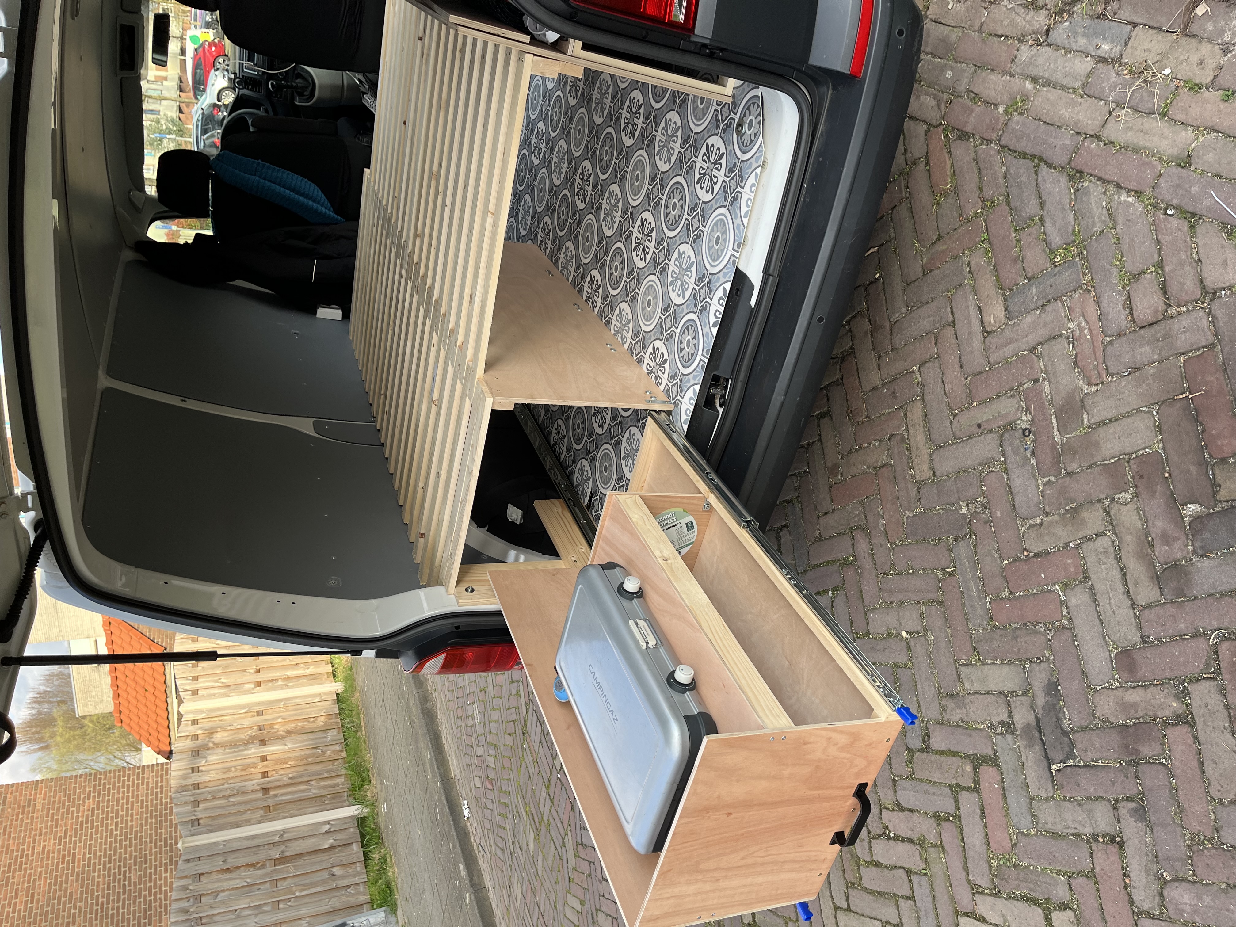 Qua inrichting heb ik een uitschuif bed gemaakt, met de keuken als een lade eronder. De koelbox staat tussen bed en bestuurdersstoel (dan kan ik hem ook makkelijk in de sigaretten aansteker doen, en kunnen we erbij tijdens het rijden).