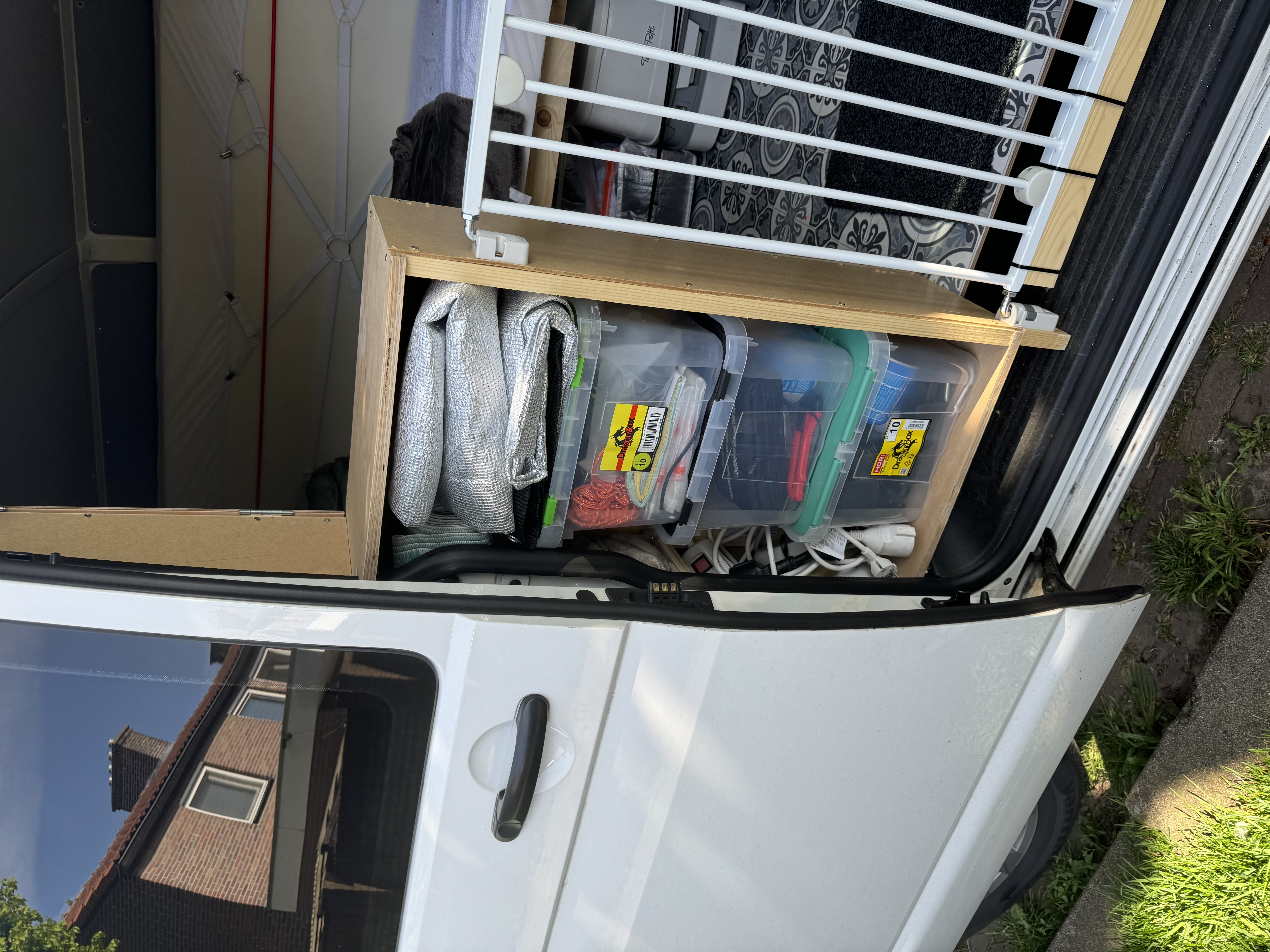 Aan de andere kant heb ik een lange, hoge, ondiepe kast, die ook voor de schuifdeur zit. Dat gedeelte moet je bij door de schuifdeur helemaal te openen. Maar voor instappen heb je die ruimte niet nodig natuurlijk dus zo nog beetje extra kastruimte. Geeft ook meteen een leuk tafeltje. Voor de hondjes een hekje.