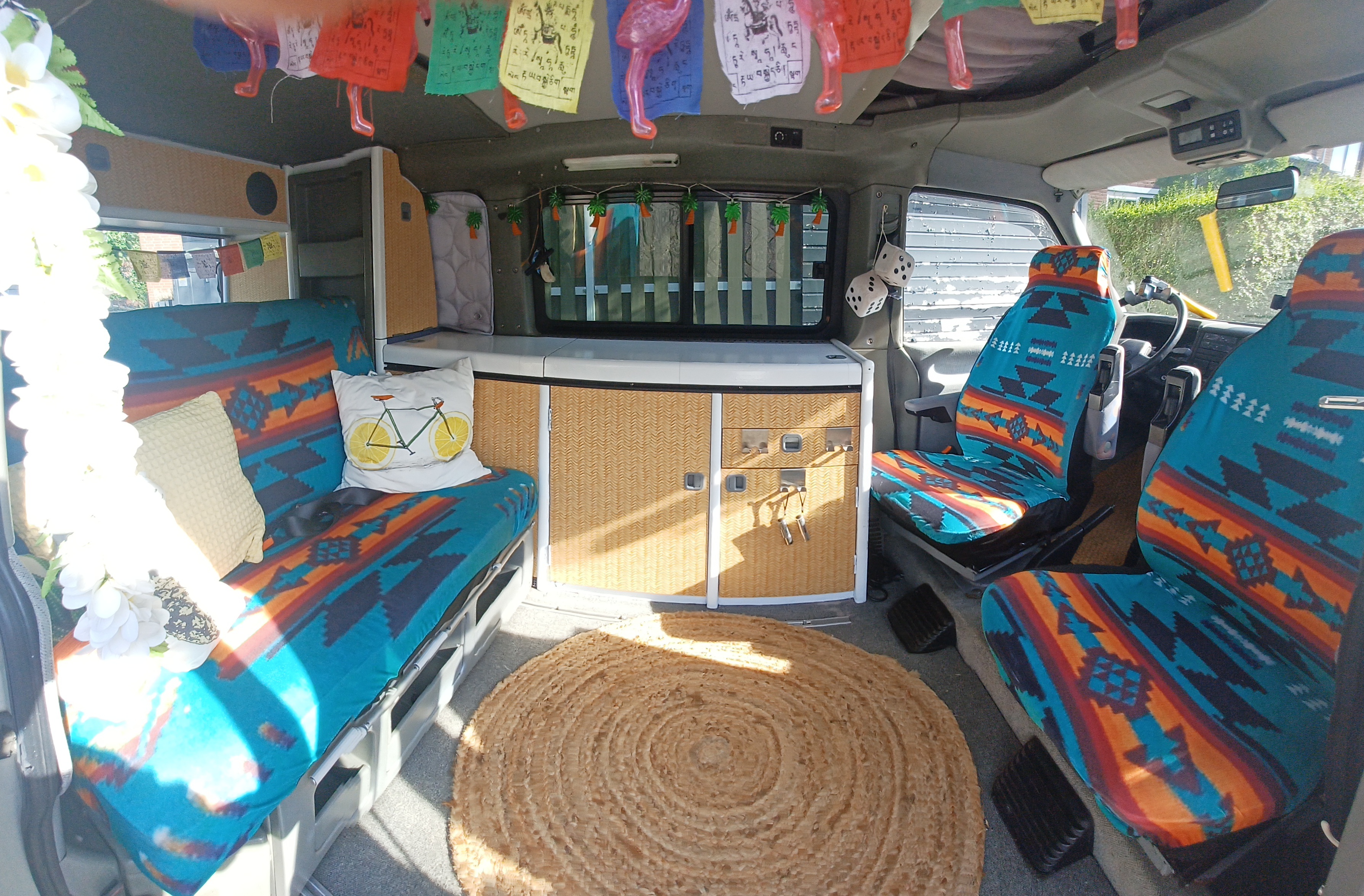 Interieur hebben we opgefrist met witte verf, bamboe plakfolie en stoelhoezen. Uiteindelijk zouden we ook het tapijt willen vervangen voor iets onderhoudsvrijer voor tijdens het voor-, en najaar (regen, modder).