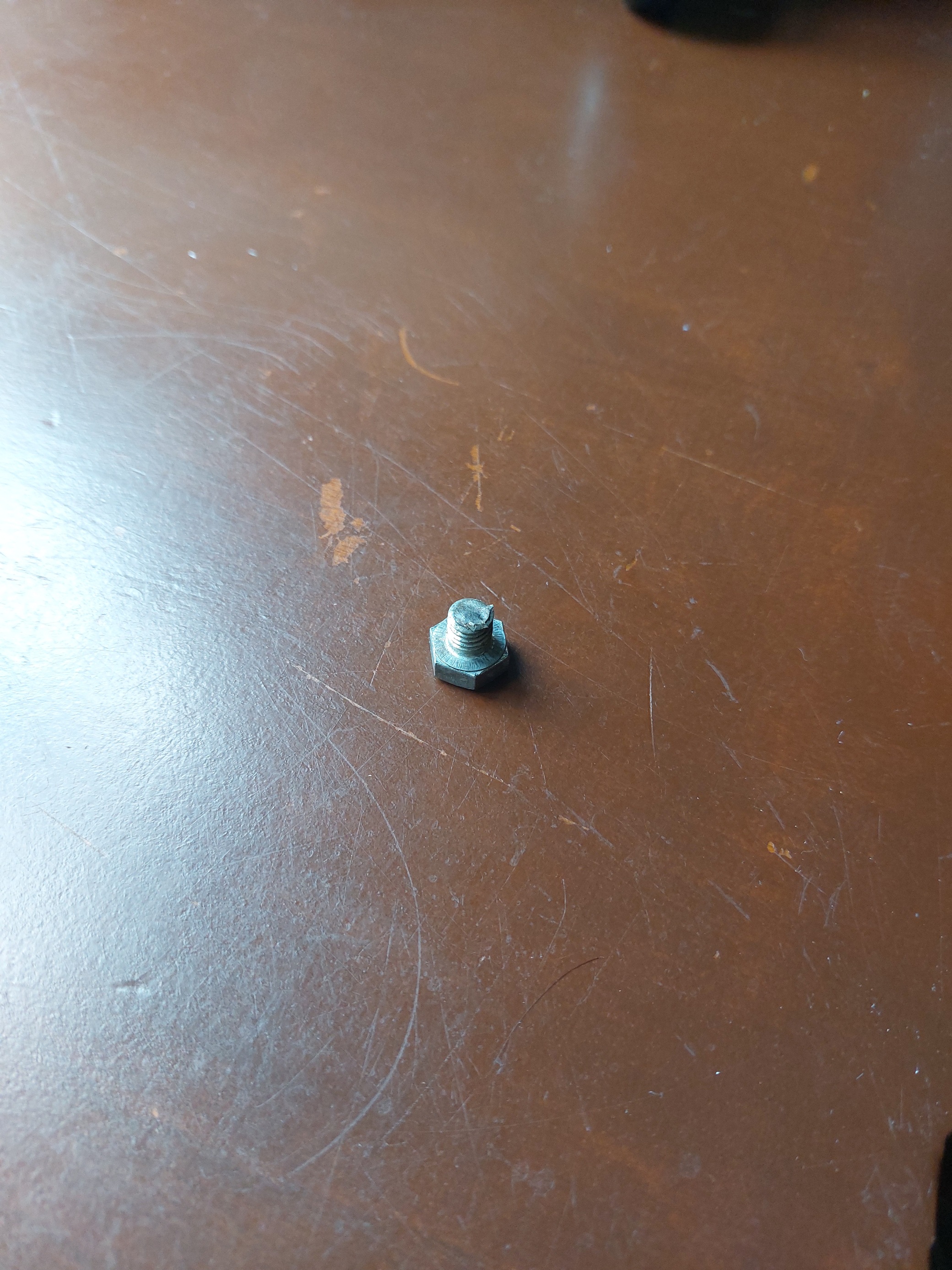 Bij de tweede rit een vreemd geluid , blijkt er een bout in het linkervoorwiel te zitten .