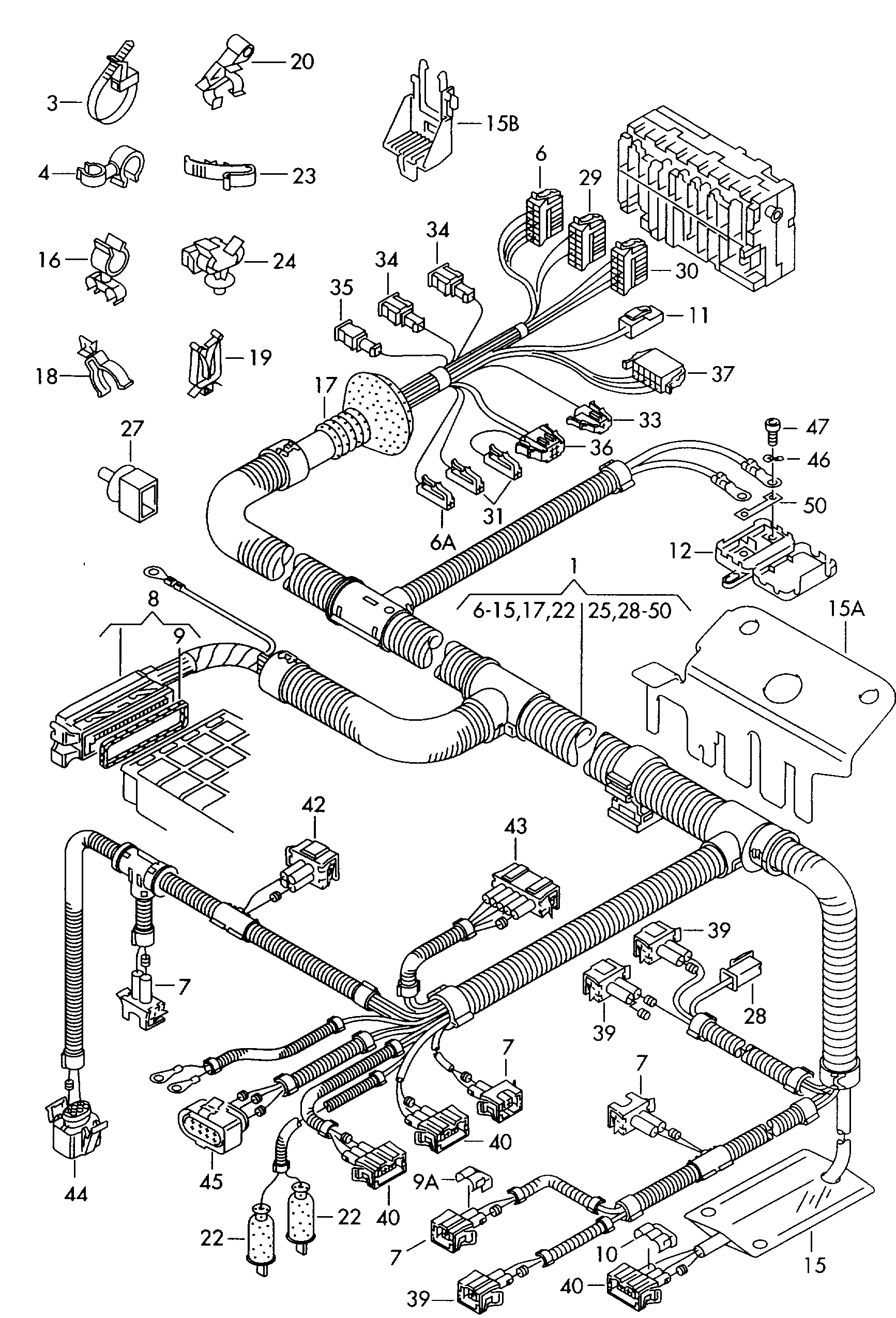 Het paaltje eindigde zo goed als klem tegen het motorblok aan, soort van precies tussen de dynamo (wel schampschot) en de dieselpomp, op de cosmetische zaken en een even platgedrukte koelleiding is alleen van 1 sensor de aansluitstekker bijna afgebroken, dat had dus veel gekker kunnen uitpakken... Maar ik zoek me een ongeluk naar welke sensor dat dan is? Hij zit op bracket met onderdeelnummer 7D0971789, nr 15A uit kabelboom 97162, en vanaf rechts gezien op de 3e plek. Ik vermoed op de 1e plek: snelheidssensor (?), op de 2e plek: gloeipluggen (?) en dan zou het zomaar de sensor voor de achteruit kunnen zijn (3579722752). Maar als ik daar op zoek vind ik alleen een losse sensor, terwijl het er op lijkt dat wat er nu zit toch echt een vaste aangegoten kabel moet hebben.