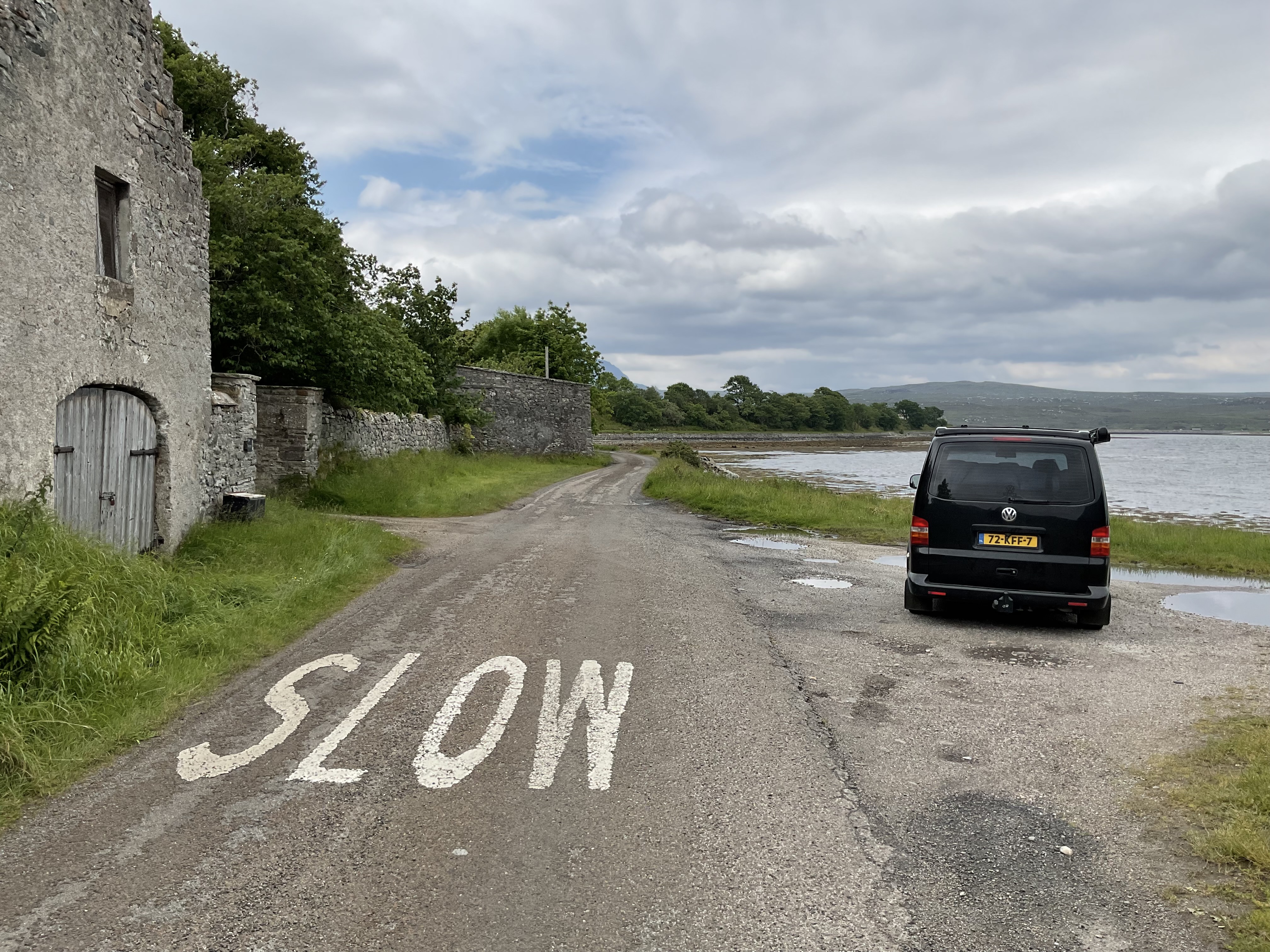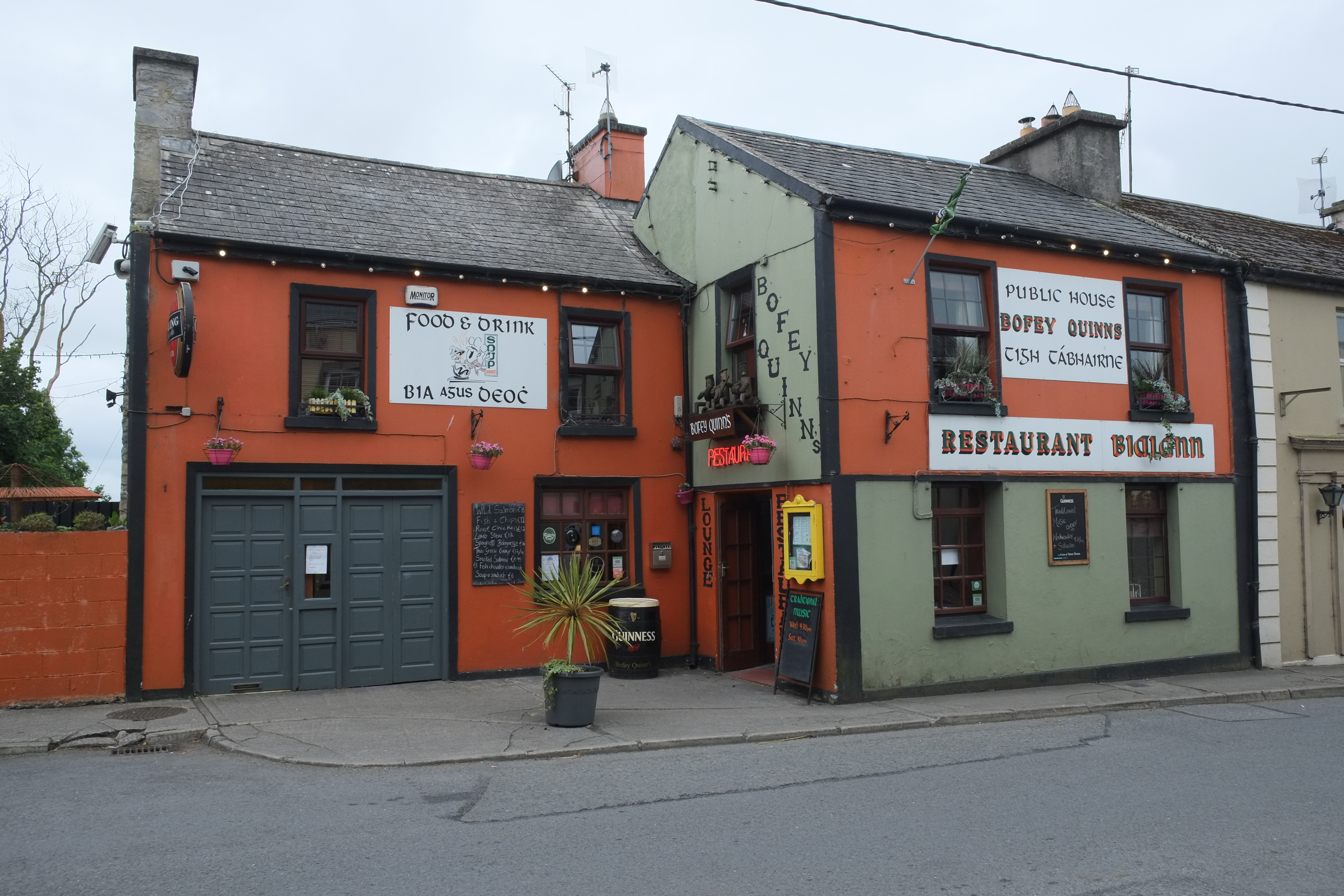 Op de foto's ons busje met zijn oudere broertje (oranje) en zijn jongere Braziliaanse neef (blauw) op Corofin camping en de pub daar tegenover.