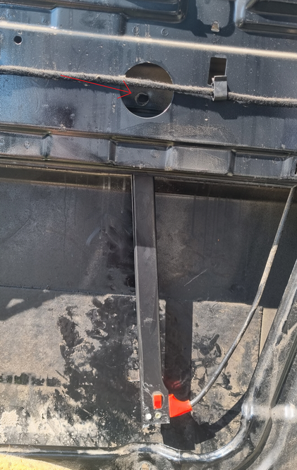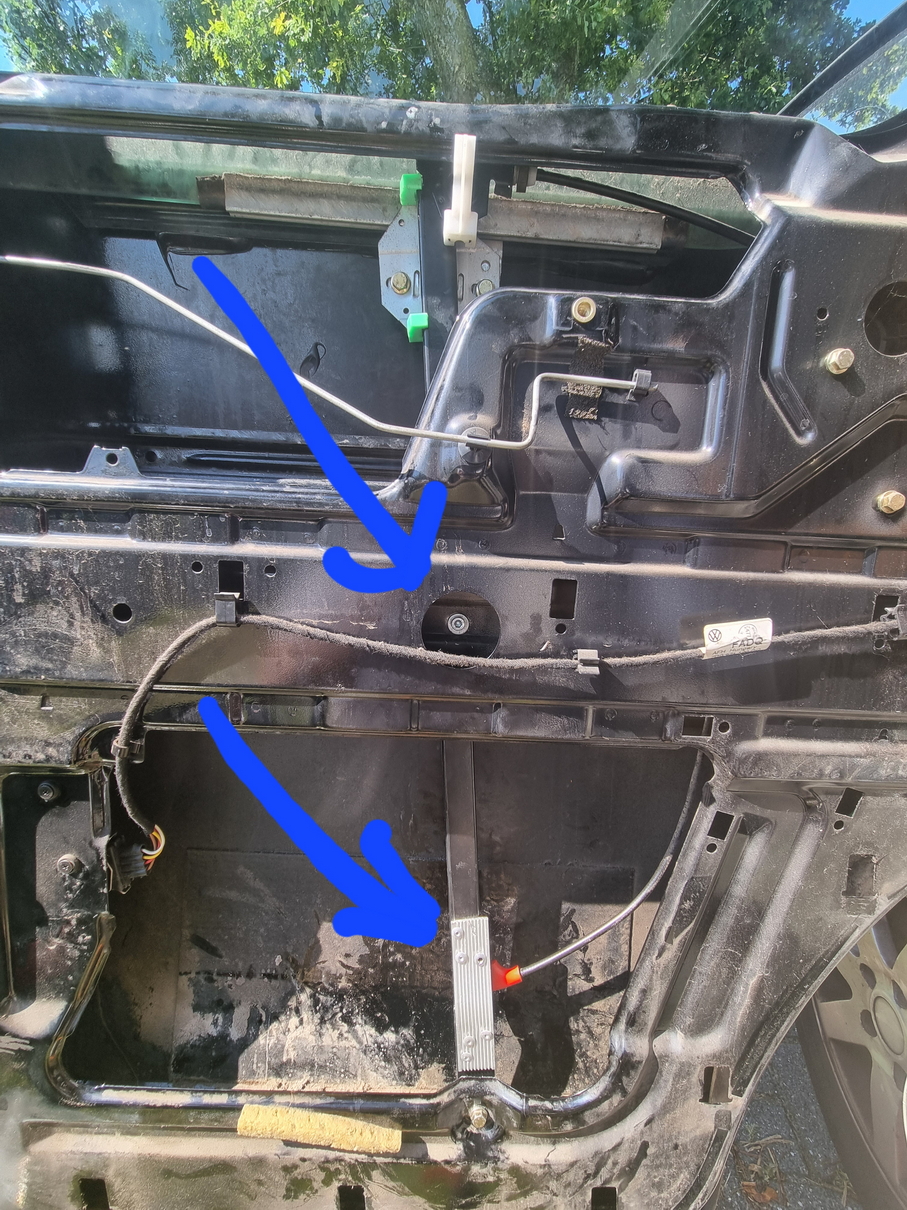 De geleider waarlangs het raam beweegt, bleek gebroken. De geleider wordt halverwege ondersteunt met een flinke bout, maar die is ooit los gegaan waardoor hele zaakje lange tijd los heeft gehangen en de geleider onderaan heeft doen scheuren.