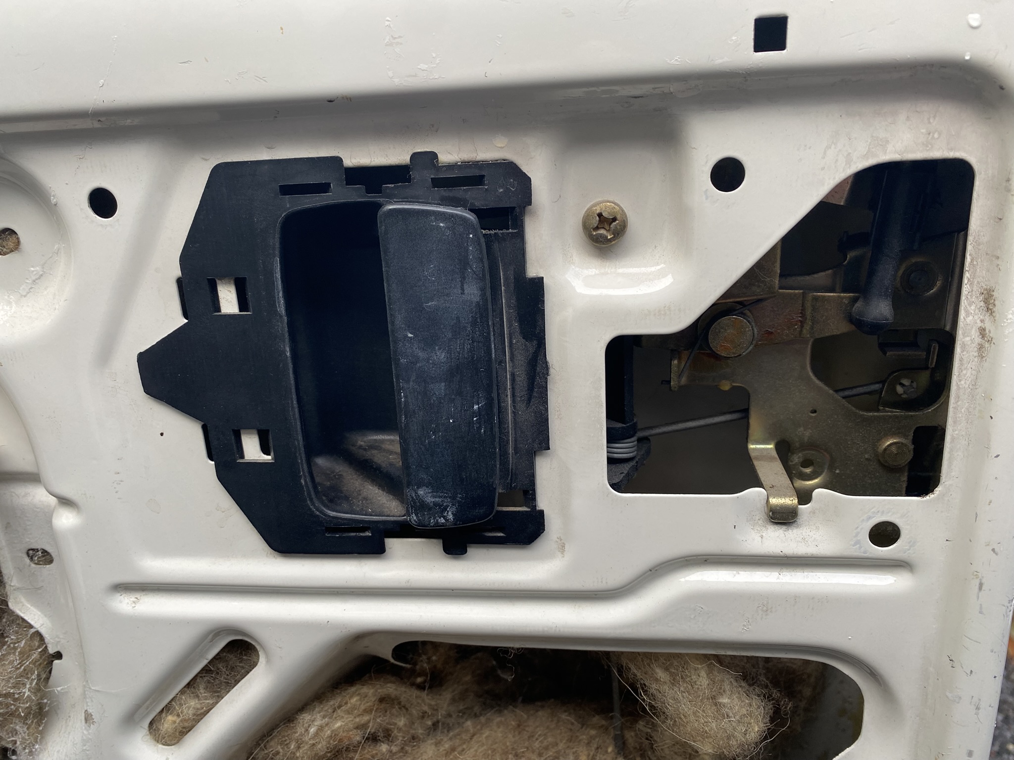 Nu ben ik bezig om de achterdeuren af te werken met vilt, wat opvalt is dat de rechterklep van buiten wel te openen is maar van binnenuit niet opengaat.