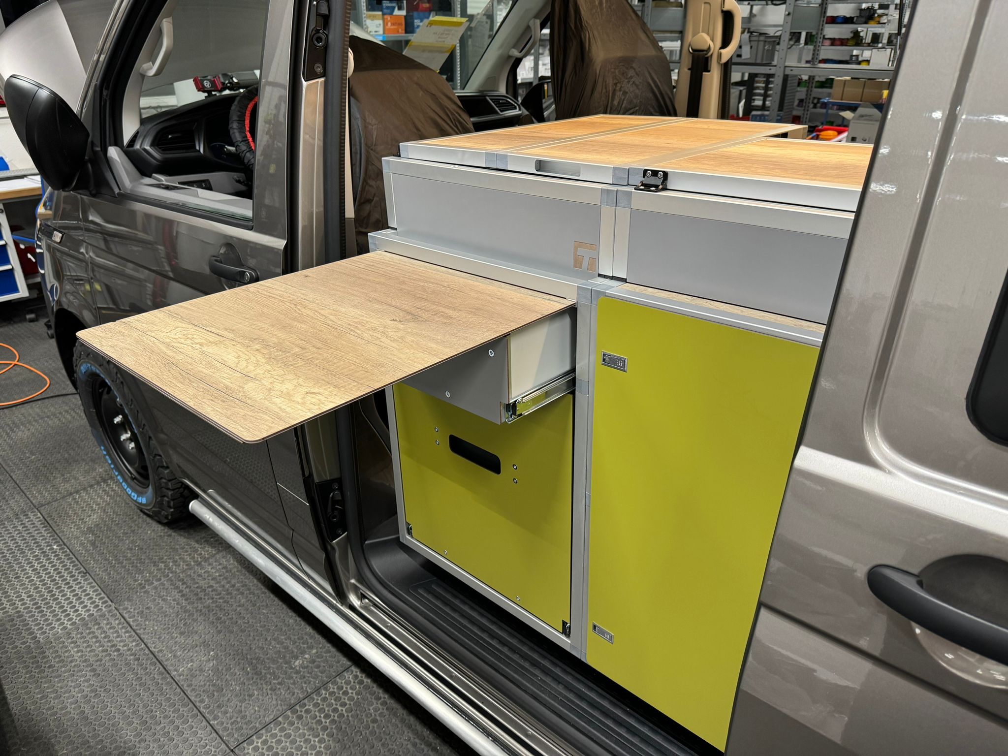 De bus is zeer krap voor 2 personen, maar ruimer dan een Troopy of Landy met hefdak. Er kraakt niets op onverhard in tegenstelling tot een California 4Motion maar dat is ook geen goede vergelijking. Op de meubels kan je gewoon staan, zijn tevens krasvast en extreem licht. De lades vliegen onder geen enkele harde schokken open in tegenstelling tot sommige druksloten bij andere fabrikanten. Luchtvaart- en marinetechniek.