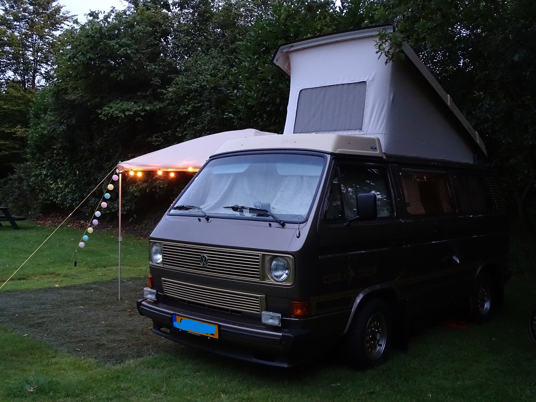 Bij een campingwinkel in Winterswijk hadden we een bus parasol luifel gezien met 2 zijwanden. Het ontwerp sprak ons erg aan maar de nylon achtige stof vonden we maar niets, waarschijnlijk niet waterdicht en past m.b.t. de kleur niet bij onze bus.