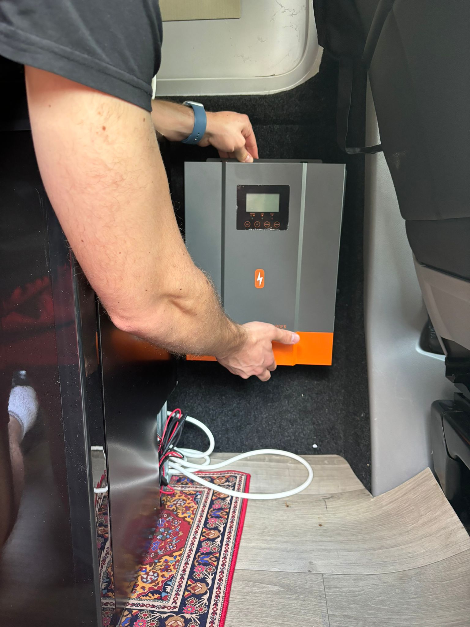 1600watt omvormer, Acculader en MPPT in 1. Iets wat overkill voor de nu nog kleine accu, maar wil eerst dit proberen voordat we de bus vol knallen met 300AH lithium wat we toch niet gebruiken. Goed afzekeren en montage gaat compleet volgens de richtlijnen.