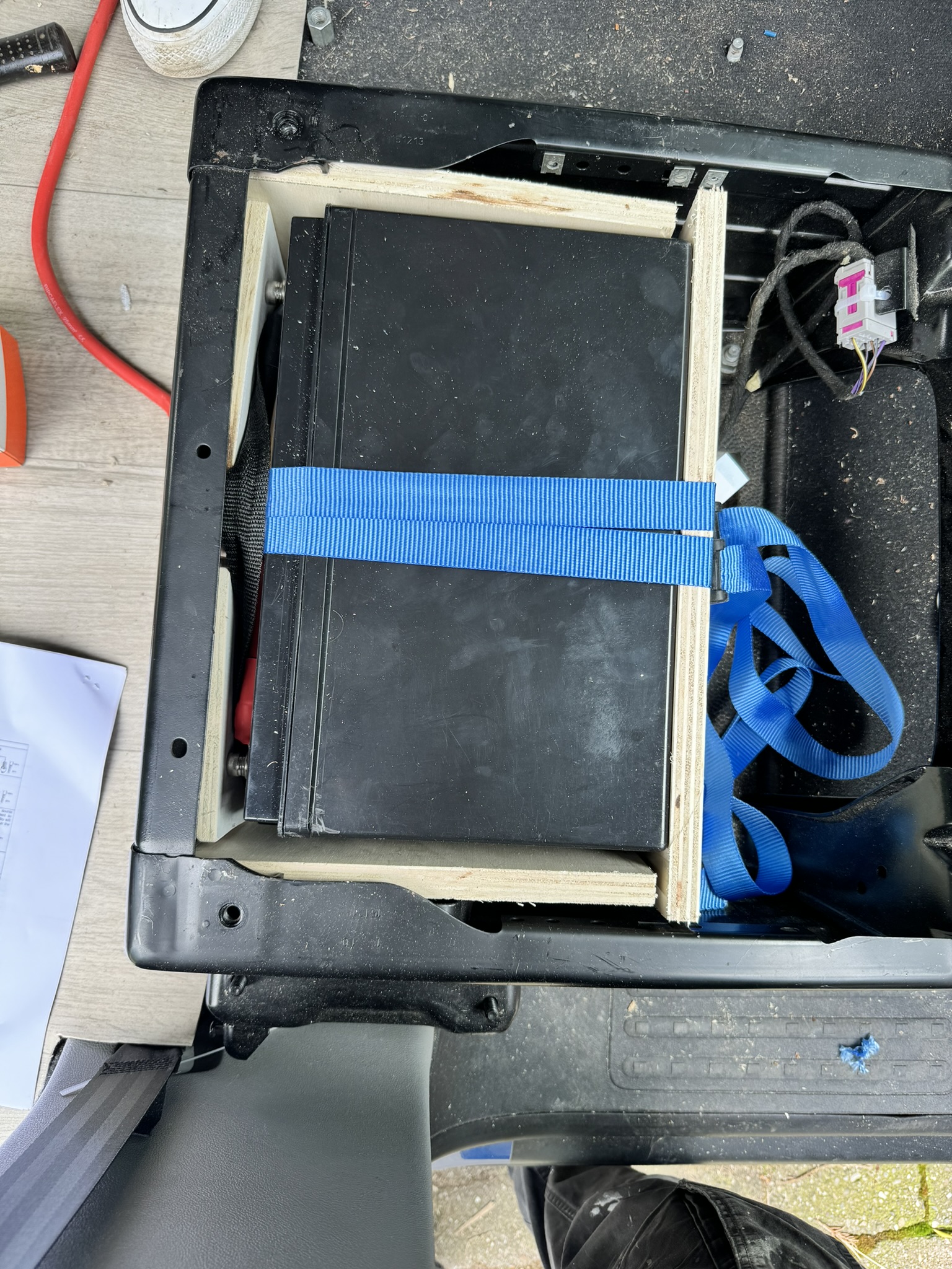 De accu moet natuurlijk goed beschermd in een bak onder de stoel komen. Van hout hebben we mooi een frame gemaakt, dit moet bij impact en beweging niet kunnen schuiven en/of de accu doorboren.