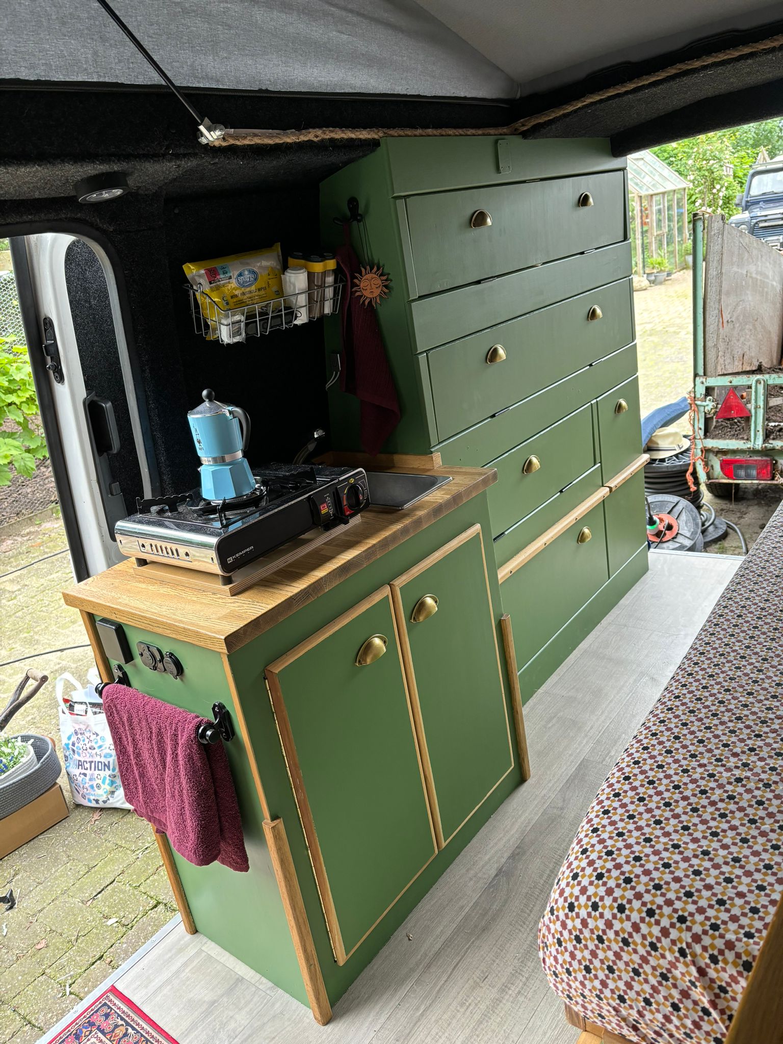 Verder zit er dus netjes een waterkraan in, spoelbakje en een kookstelletje met van die gasflesjes(niet ideaal). We hebben namelijk achterin gewoon een gasfles tot onze beschikking.