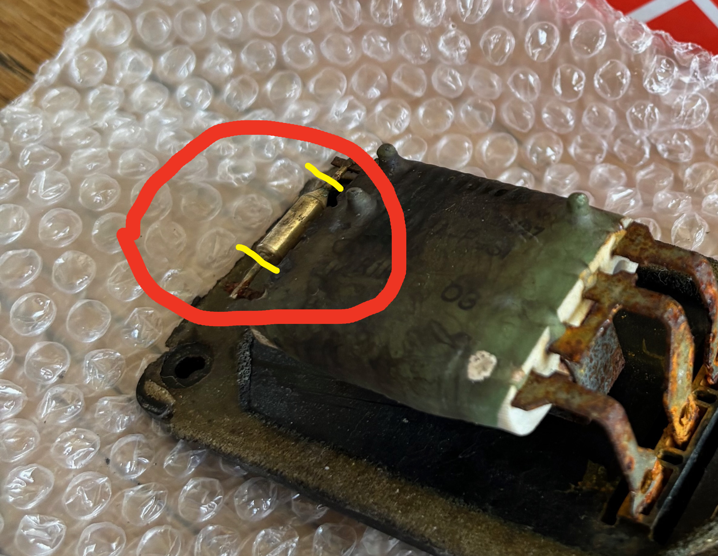 Closeup van de nieuwe kachelweerstand die niet past maar waarschijnlijk dezelfde functionaliteit heeft: