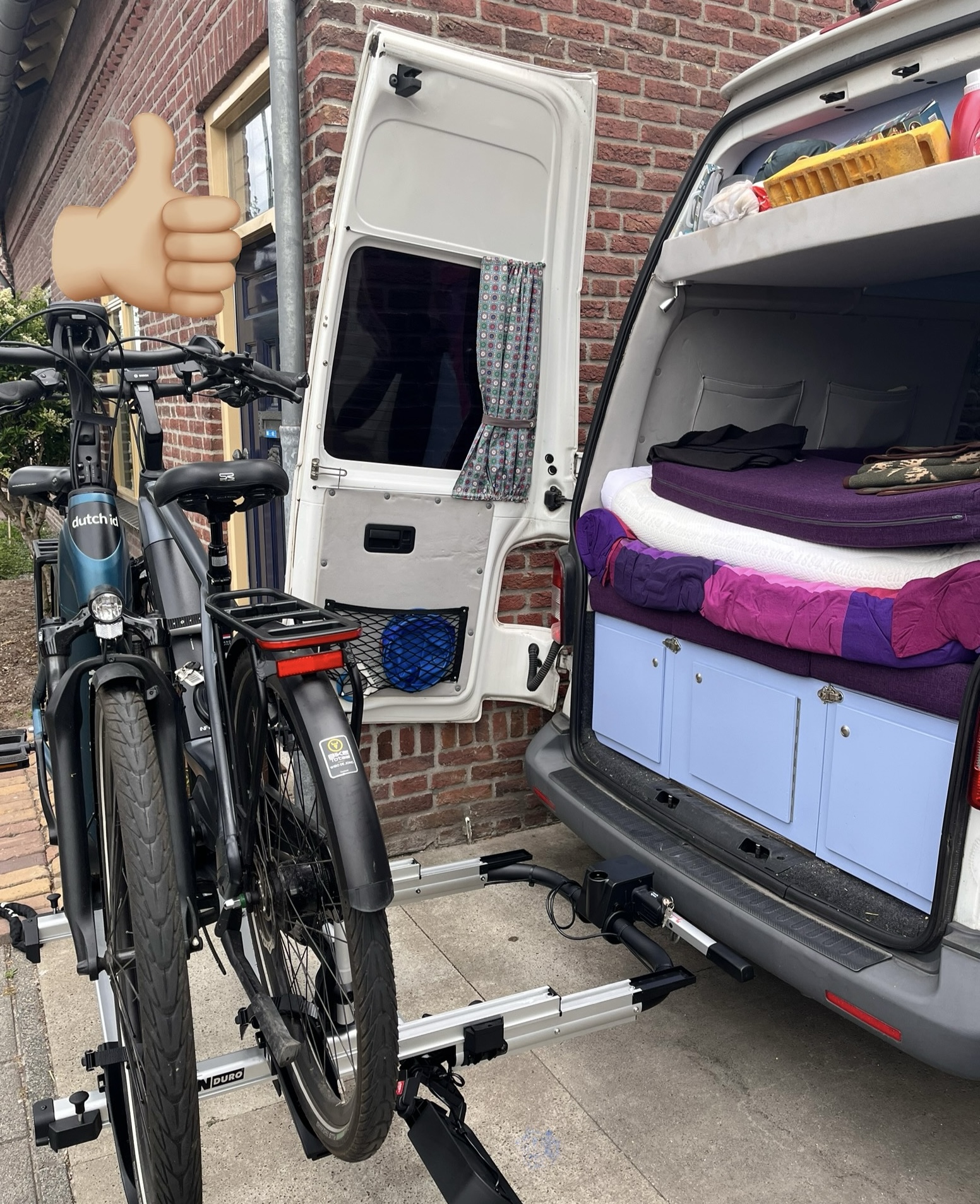 Waar we natuurlijk écht benieuwd naar zijn is die zelfbouwoplossing van jou op basis van de Fiamma! Is die te reproduceren? Kunnen de deuren dan open met de fietsen achterop?krekwakwol schreef: 06 jun 2025, 12:54 ik heb een zelf aangepaste Fiamma fietsendrager achterop de T5 (met achterdeuren) met 2 (niet te zware) E-bikes