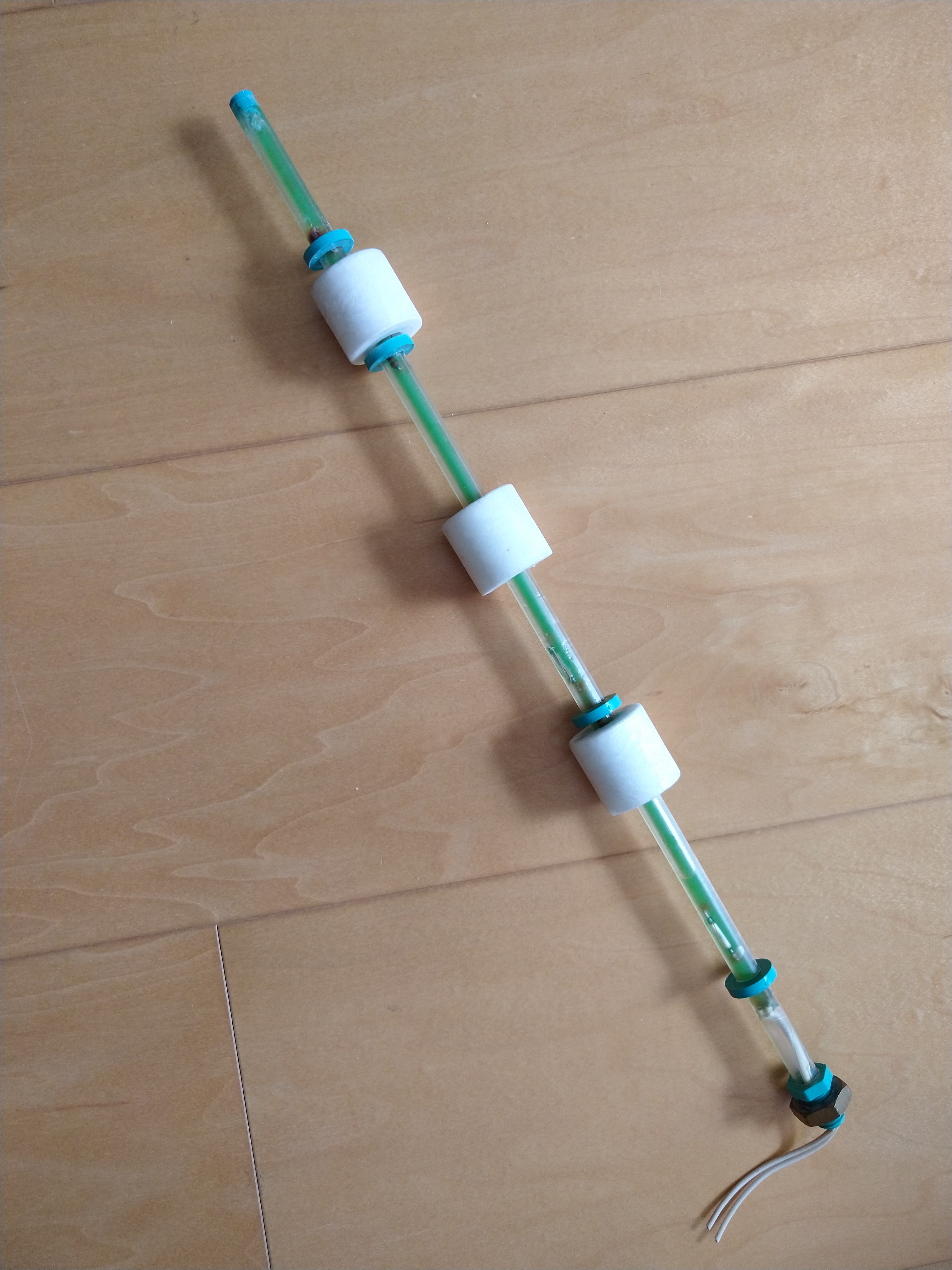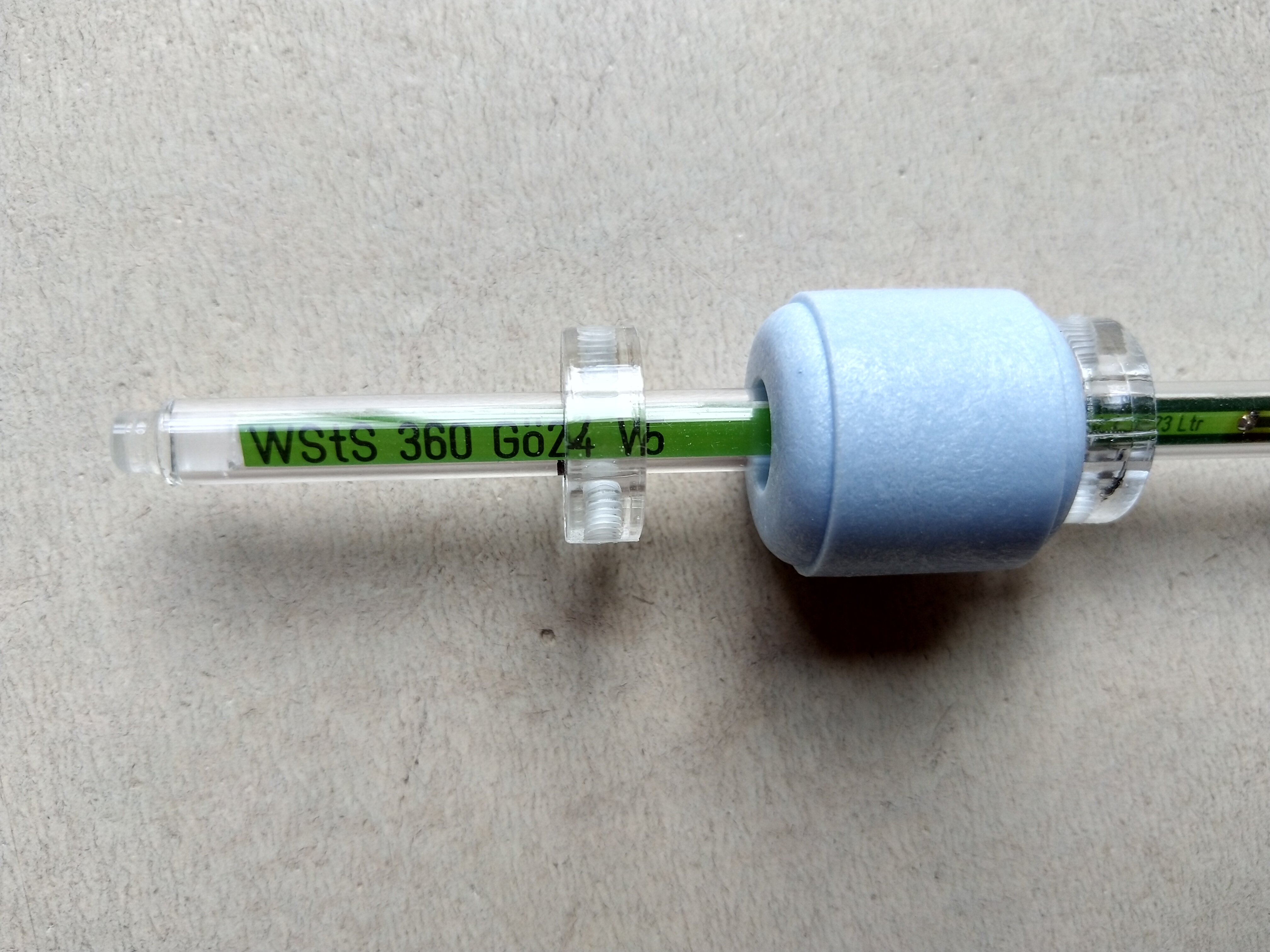 Mijn accu was helaas leeg, dus geen foto gemaakt, maar het was een wit rond buisje met 1 enkel rond wit vlottertje daar omheen, die over het buisje heen en weer kan schuiven.