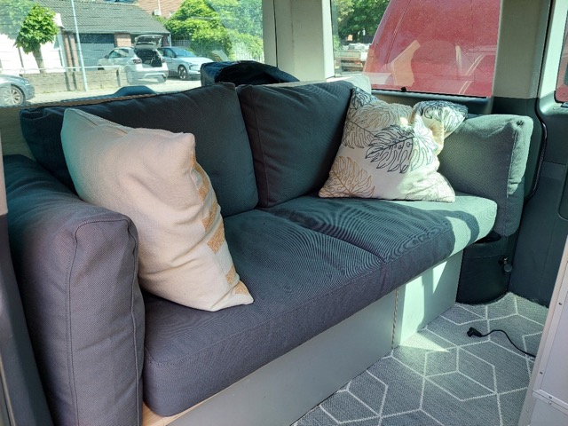 Nu de kinderen niet meer meegaan hebben we vorig jaar besloten een demonteerbare camperinrichting te maken: voor de zomervakaties halen we de 3 persoonsachterbank eruit en vervangen we door een op IKEA keukenmeubels gebaseerde zitbank (met IKEA kussens)/lades en een ladenblok. Dit wordt vastgezet met de standaard bevestigingsmiddelen in de multivan-vloerrails. We slapen niet meer beneden (de bank is immers weg) maar boven. En sinds we de standaard lattenbodem hebben vervangen door een schotelbodem en matras van SQUergo.de slapen we bijna nog beter dan thuis.