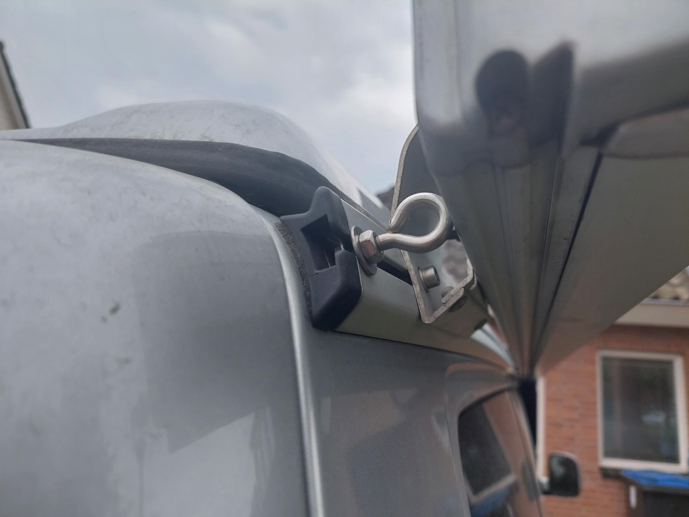 2 achterste bevestigingpunten van de cabine maak je met zuignappen aan de klep vast en de 2 voorste bevestigen we aan schroefogen in de multirail. Je kan zo uitstekend onder de achterklep douchen.