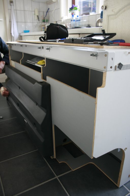 De vuilwatertank zit tegen de binnenwand achter het keukenblokje, daar is inderdaad moeilijk bij te komen zonder demonteren.