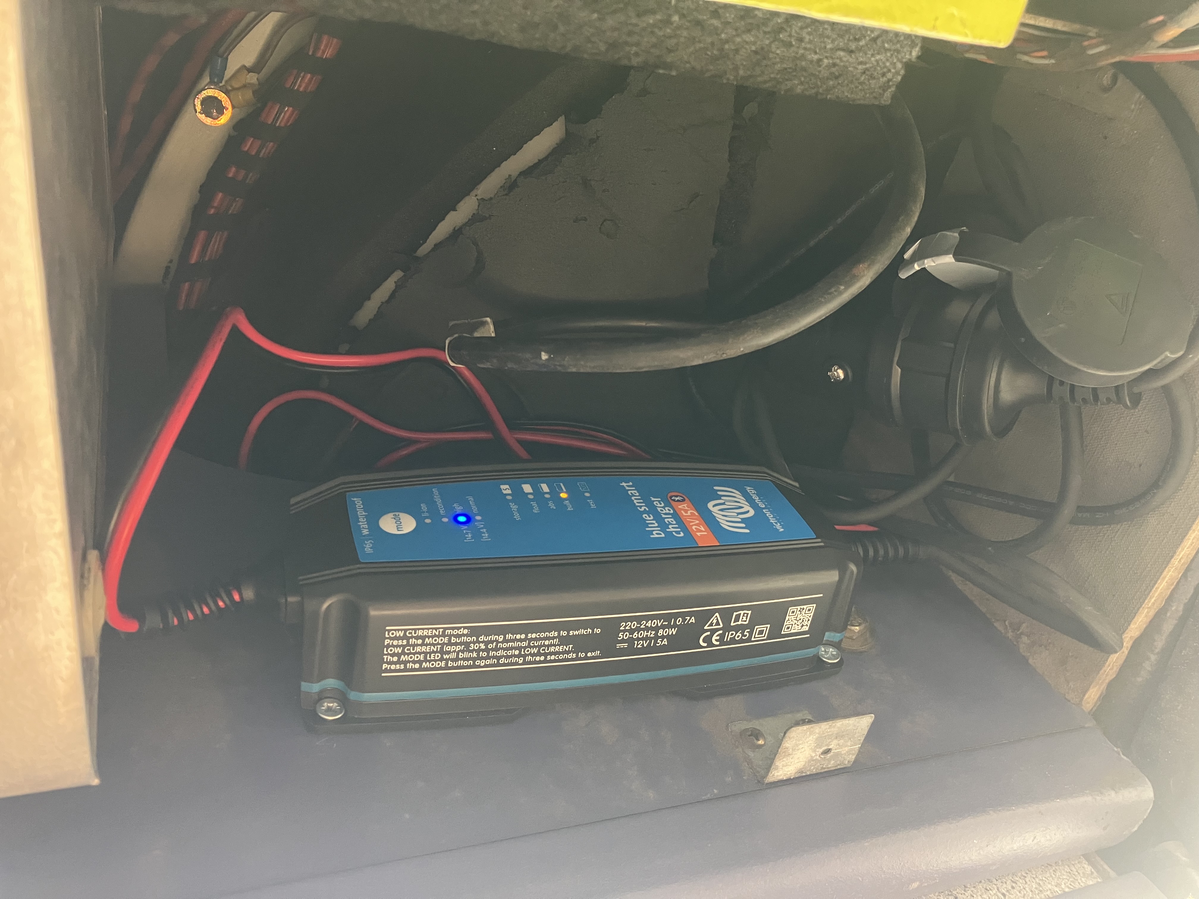 Nieuwe Victron 12V/5A lader gekocht, erin gezet, en kan nu via walstroom dus m’n accu goed vol krijgen.