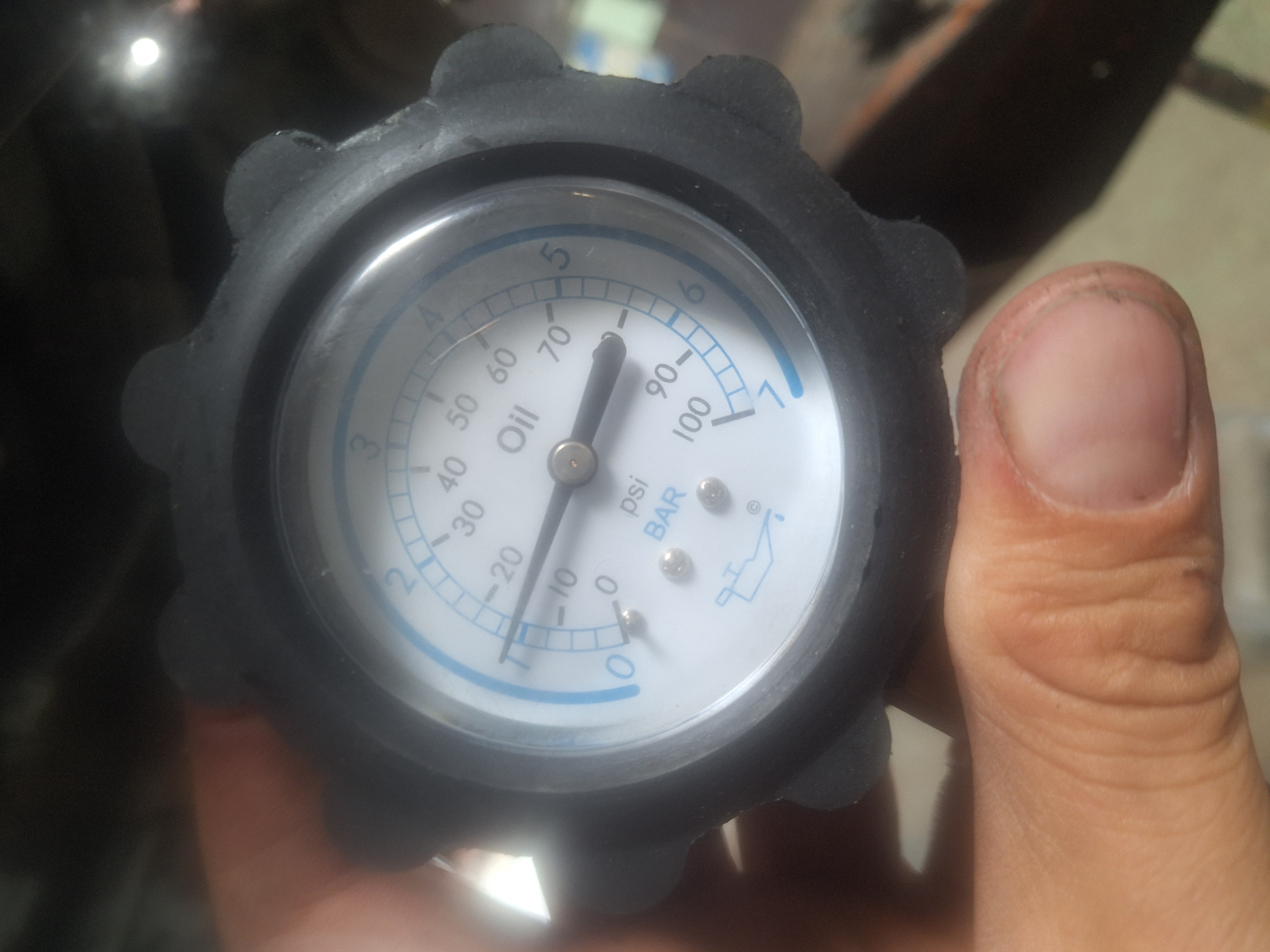 Ik heb gezondigd, ik weet het. En ik zal het nooit meer doen, toch niet wat deze zonde betreft. Maar de oude pomp zit erop, en alles werkt, de auto rijdt. De olie die ik gebruik is castrol gtx 5w40 mv, acea c3. De foto's geven de oliedruk meter weer, warme motor, stationair, en 2000 toeren.