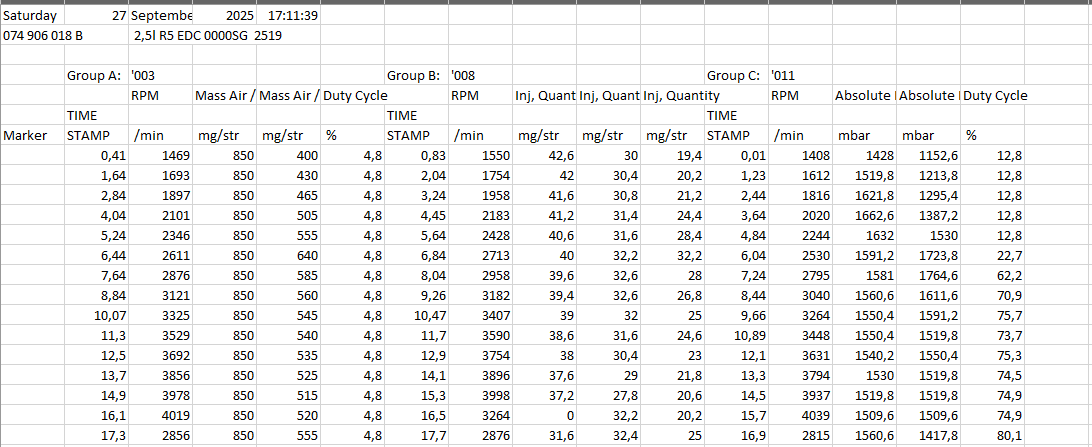 Wat ik zelf zie, is dat de MAF gevraagd erg verschilt met MAF actual. Dat lijkt op een defecte LMM. Kan iemand mij helpen met deze data? Ook voor de andere groepen weet ik niet exact wat de specs moeten zijn.