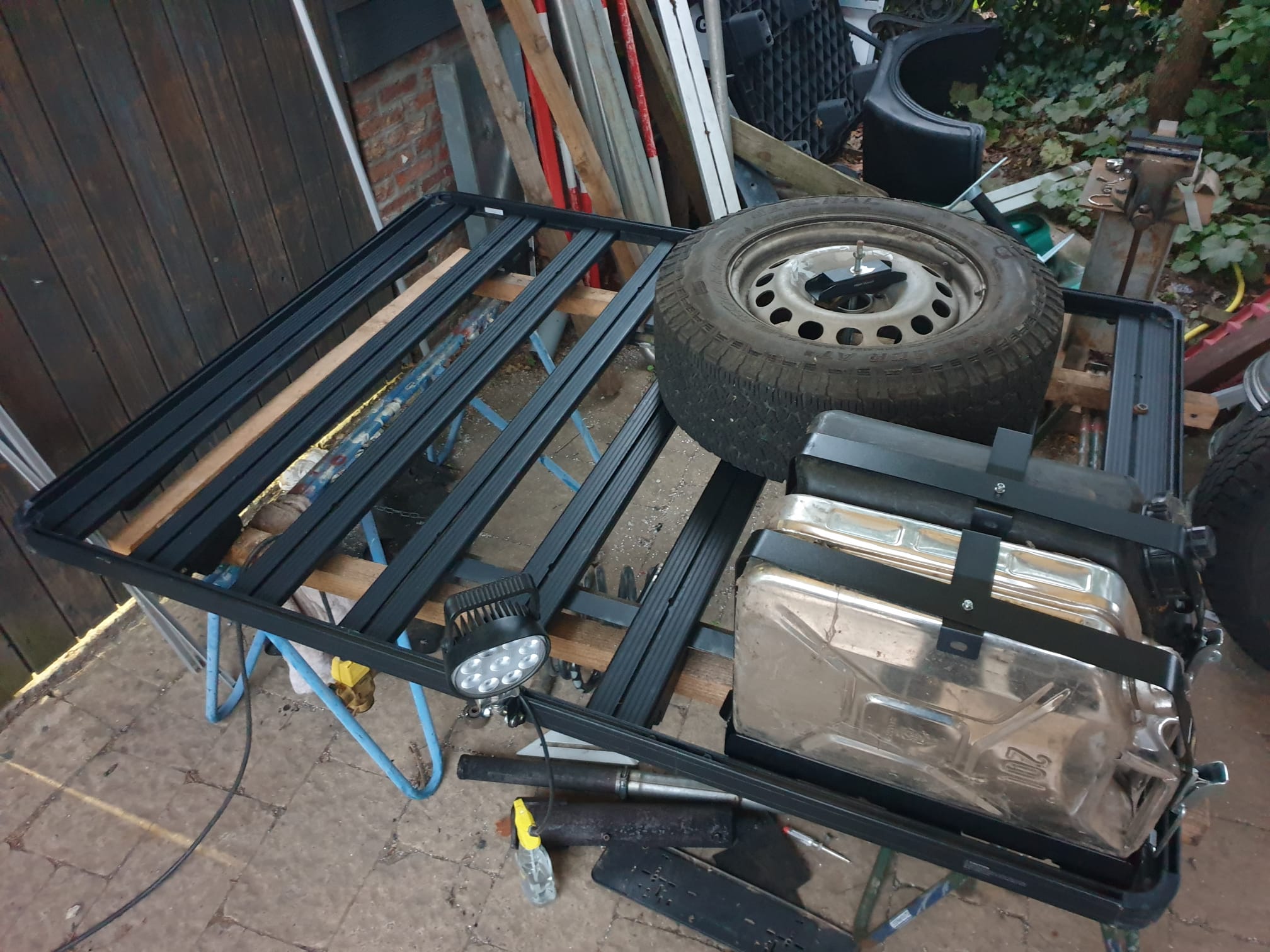 Kompleet met reservewielsteun, zelfs twee jerrycan houders nieuw in doos, een verstelbare floodlight, losse lamp montage beugel en er zit een steun onder voor een campingtafel denk ik. Verder nog diverse beugels voor montage naast de dakrailing set die er nu aan zit. Los 235/65R16 wiel van de expert er even op, waterkan van NL leger en de RVS jerrycan die ik ook achterop de T3 had. Maat van de drager 1345 x 1760 mm