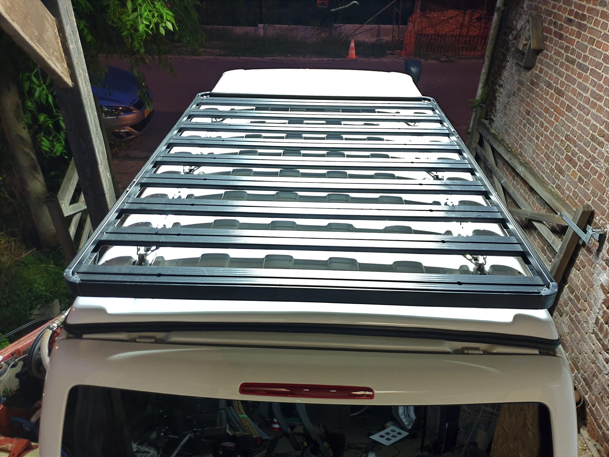 De ladingrails zit nu gelijmd en door gebout op het hefdak. Het dakrek zit er nu uitgelijnd op, met 6 boutjes vast en moet ik morgen enkel nog de overige 18 boutjes vastzetten.