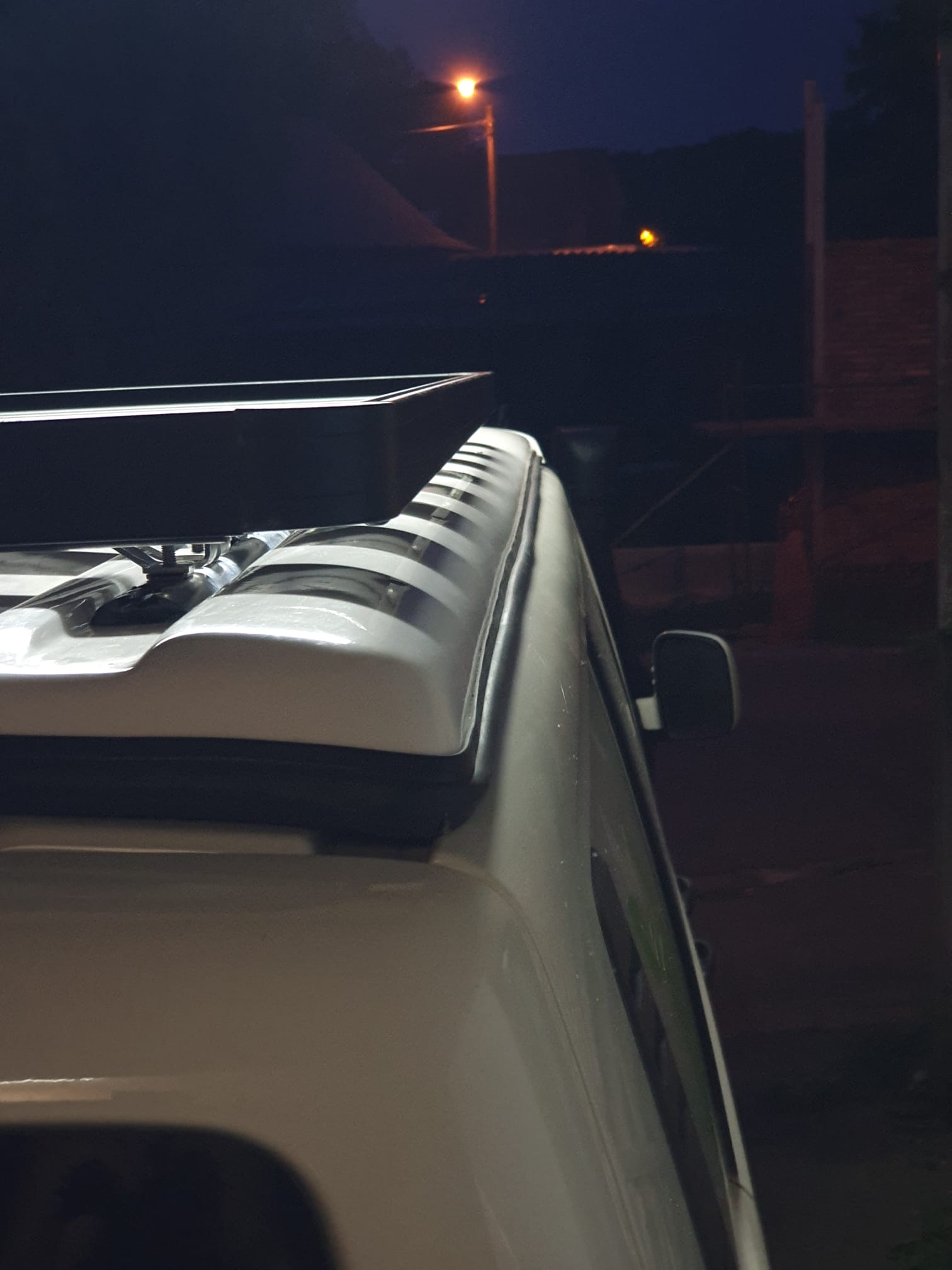 Het ene nog niet af en al naar het volgende.... heb een frontrunner dakdrager opgepikt voor op het hefdak. Frontrunner bied die aan voor California en SCA hefdaken en de gewone bussen. Kosten wel dubbel zoveel als een normale aluminium imperiaal..... wel zeer stevig maar ook weer gemiste kans met die roestende stalen boutjes....