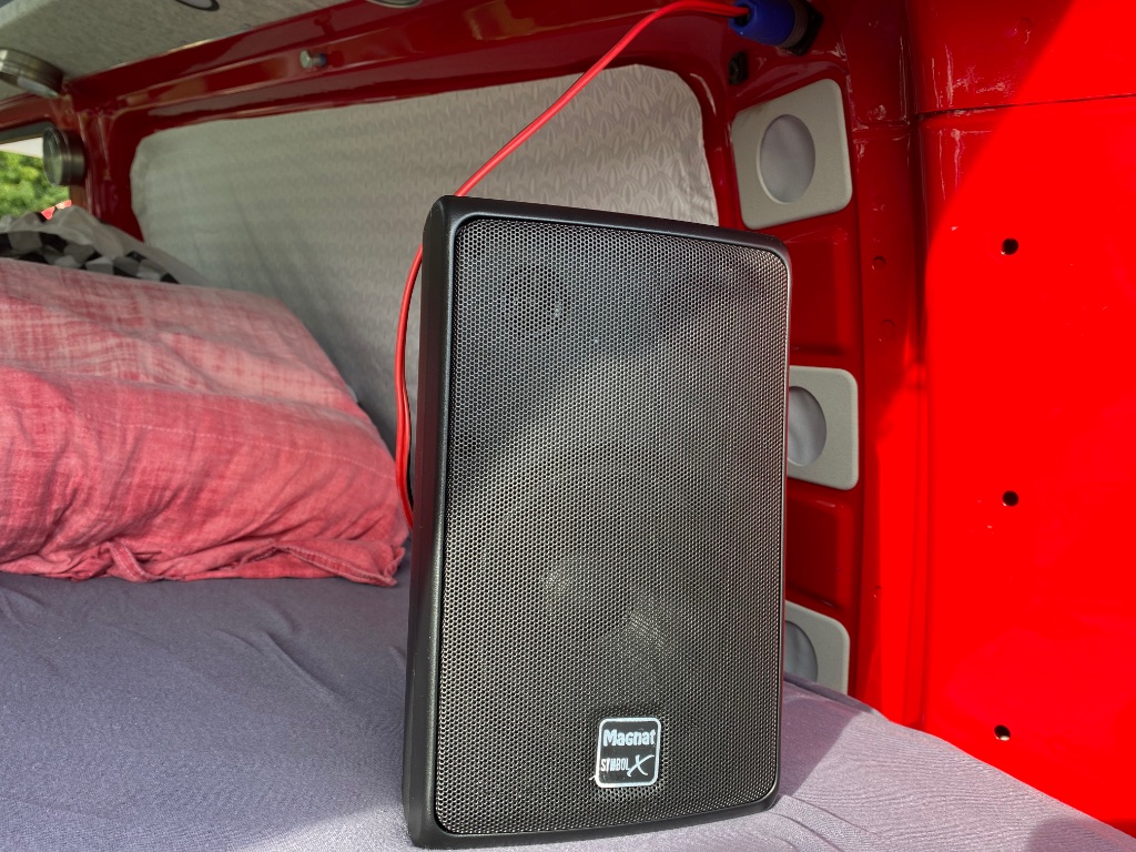 Allereerst de achter speakers. Ik dacht eerst aan kleine opbouw speakers. Dit ivm met zicht achteruit en ons slaapcomfort. Maar die klinken niet en de tijdens je slaap wil je toch je kop niet stoten. Voor inbouw speakers is er te weinig inbouw diepte en om nu in de Dstijl te zagen leek mij niet handig. Kortom ik heb nu waterbestendige van Magnat. Die zet ik neer wanneer tijdens het koken of naar binnen gericht. Daar heb ik nu goede connectoren voor gevonden. Eerder met ouderwetse speaker pluggen had ik geen succes. Dit zijn SpeakON chassisdeel en Neutrik NL2FX 2-polige speakonplug.