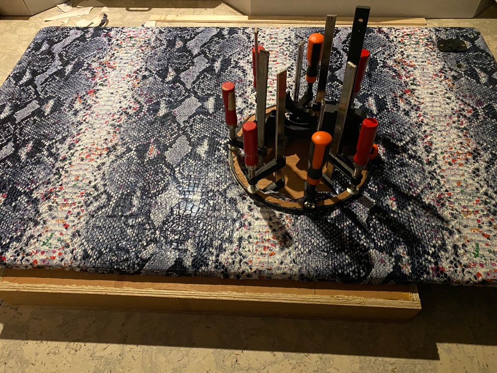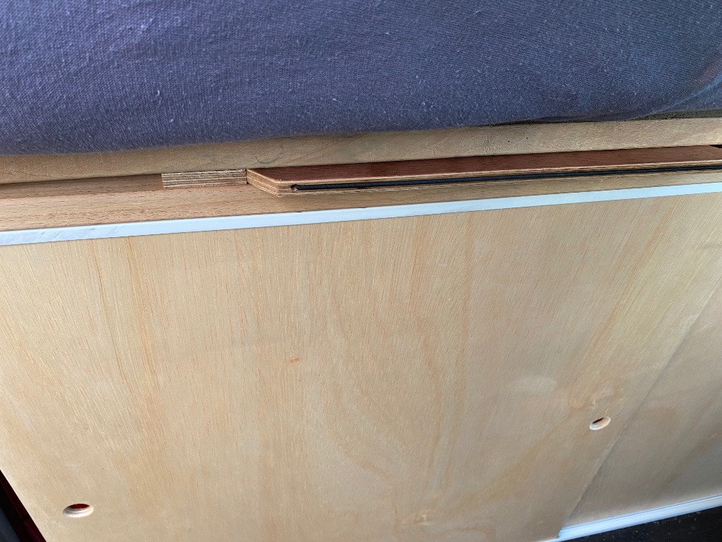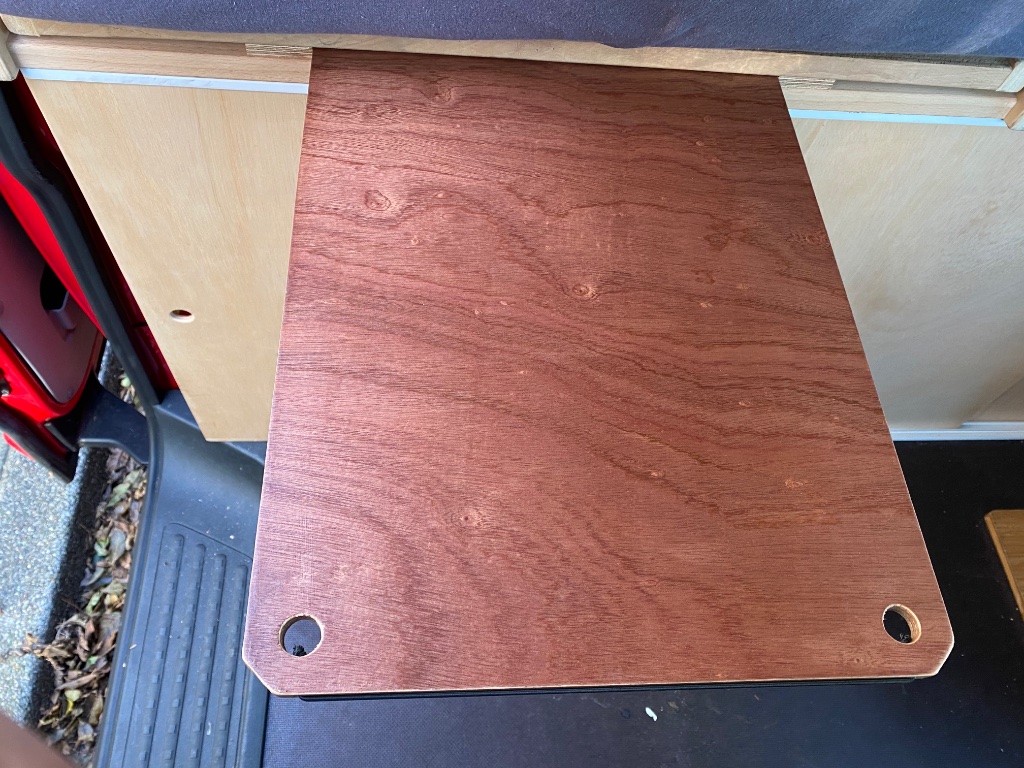 Ik heb een uitschuif tafeltje gemaakt. Met gedraaide voorstoelen heb je dan even wat meer afleg neerzet ruimte. Ingeschoven zit deze tussen de lattenbodem en de koelkast. Je ziet er ingeschoven bijna niets van. Je ziet alleen het zwarte elastiek.