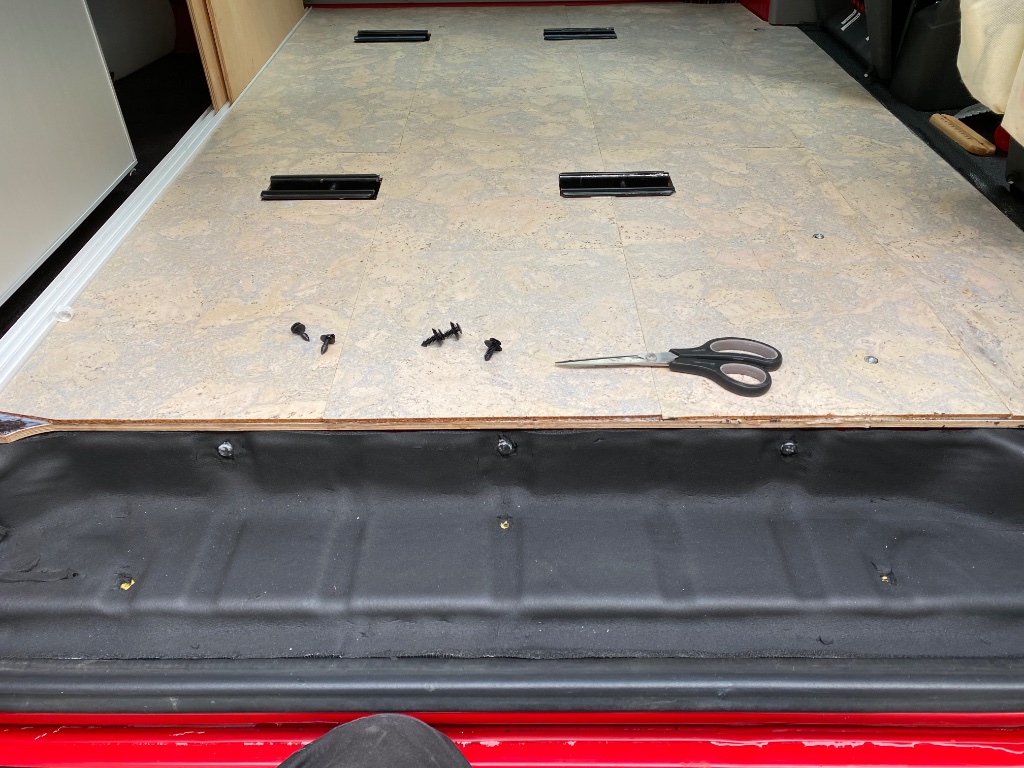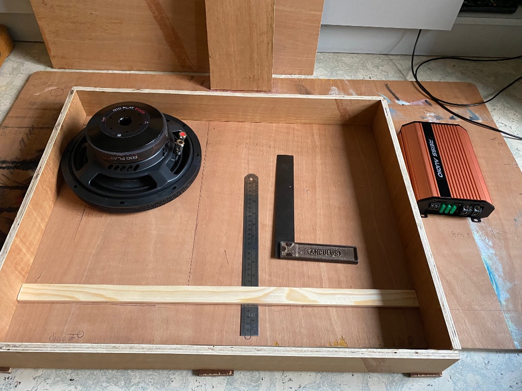 Met passen en meten wordt de meeste tijd versleten. Voor het paneel staat ook nog een keukentje en daar moet de sub grill wel naast komen. En de box botst op een carrosserie balkje. Dan maar een tijd vretende uitsparing maken.