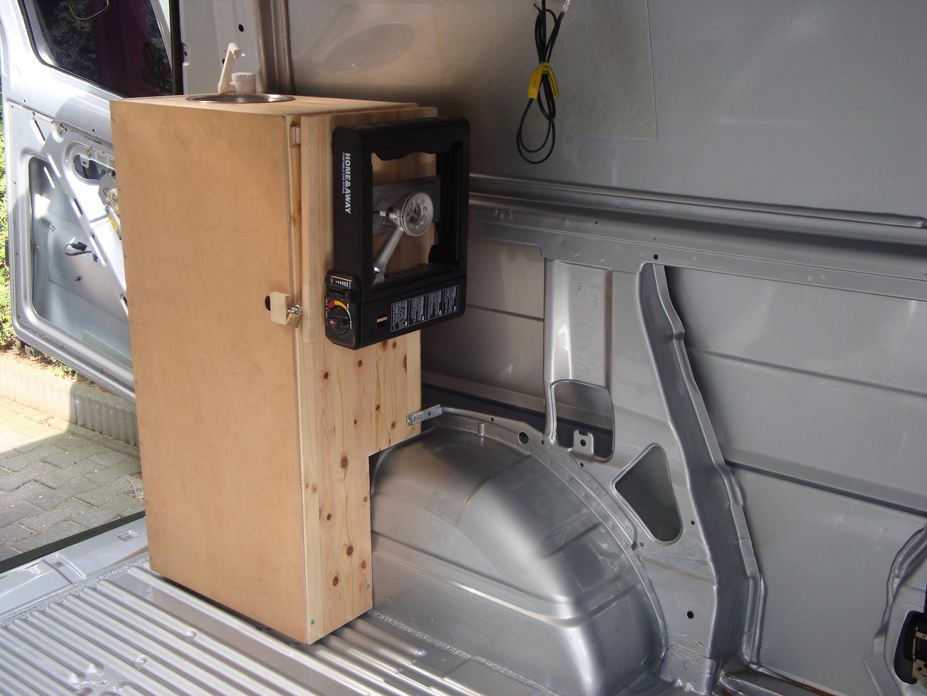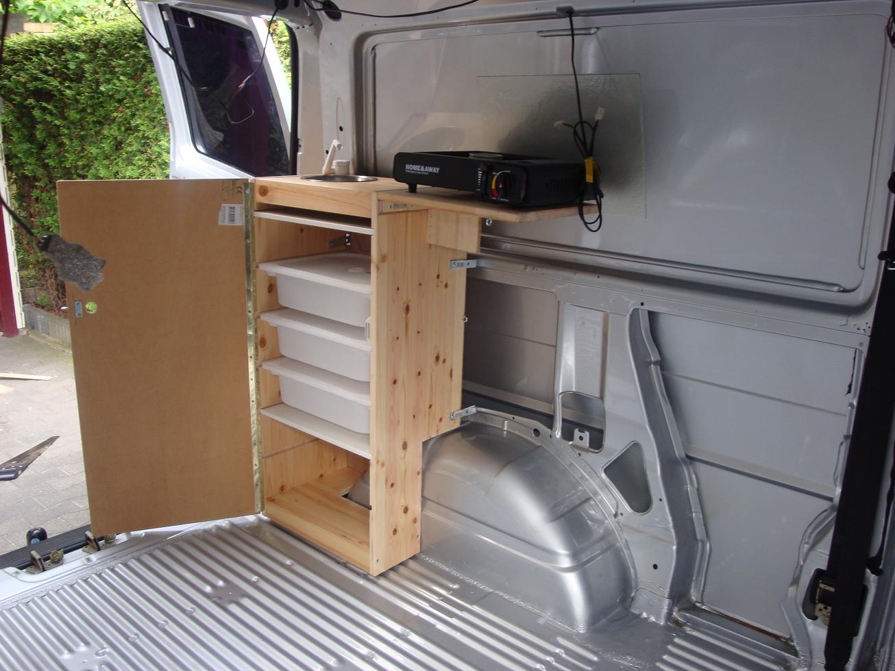 van een eigen gemaakt keukenblokje en een heel simpel bedje.