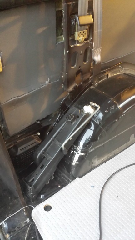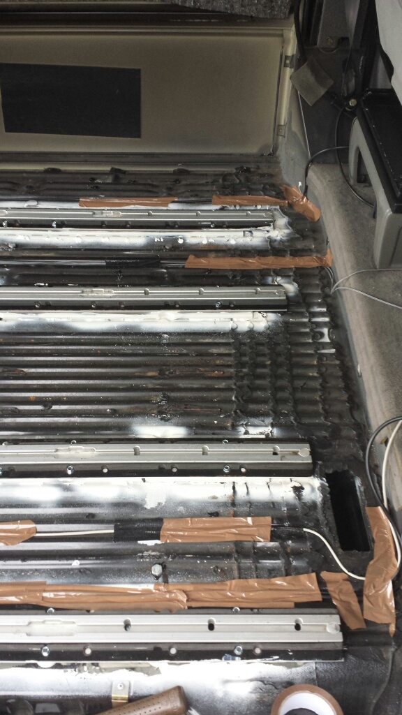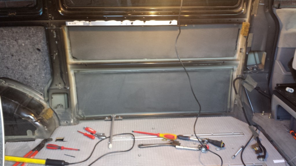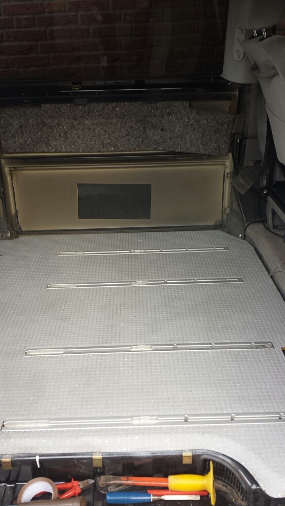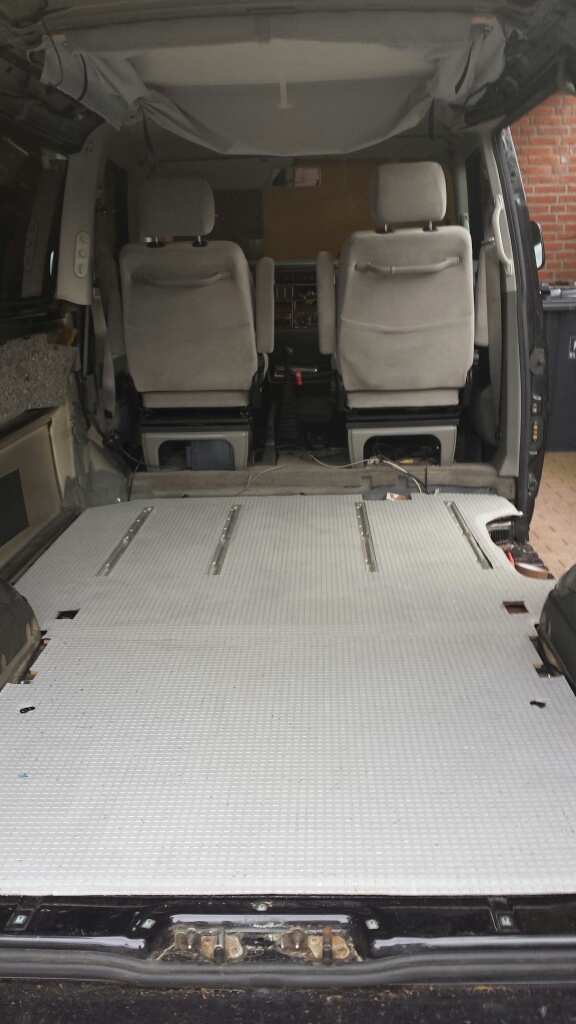 De vloer heb ik niet opnieuw gelijmd of gekit, voor zit deze mooi op gesloten in de multivan rails en tevens plakt deze nog een beetje vast op de oude kit/pek. Als het moet kan ik de vloer dus weer makkelijk verwijderen.