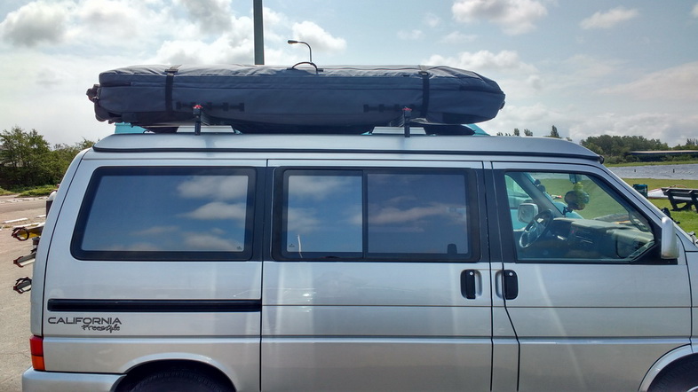 wij hebben met twee volwassenen een puber en een hond, voor de kleding twee diepe laden onder het bed. Daaronder is nog ruimte voor een bijzettent een kist met voorraden een kleine cadac, plastic afwasbak, slaapzak, gereedschapskist. Op het fietsendrager hebben we een alu kist (legerdump) waarin een grote tas met slippers,schoenen, hondenvoer, kleed voor onder de luifel en de jassen. Boven aan de fietsendrager hebben we een zelfgemaakt rek gemaakt aan de bestaande bevestiging voor de stoelen. Met warm weer kunnen de gasveren de klep omhoog houden met alles erop. Naast de alu kist heb ik met bouten de oprijblokken. De kist blijft tijdens de reis op de auto Sorry voor de beetje kleine foto.