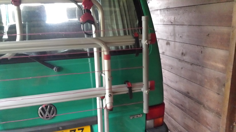 Ook heb ik een vast droogrekje geplaats aan de fietsendrager en heb ik de stokken opgehangen aan de achterkant van het kastje