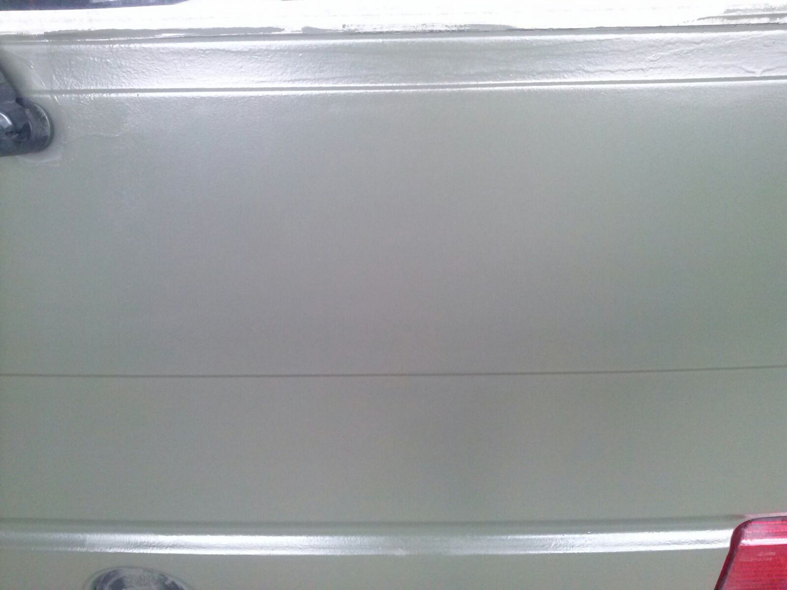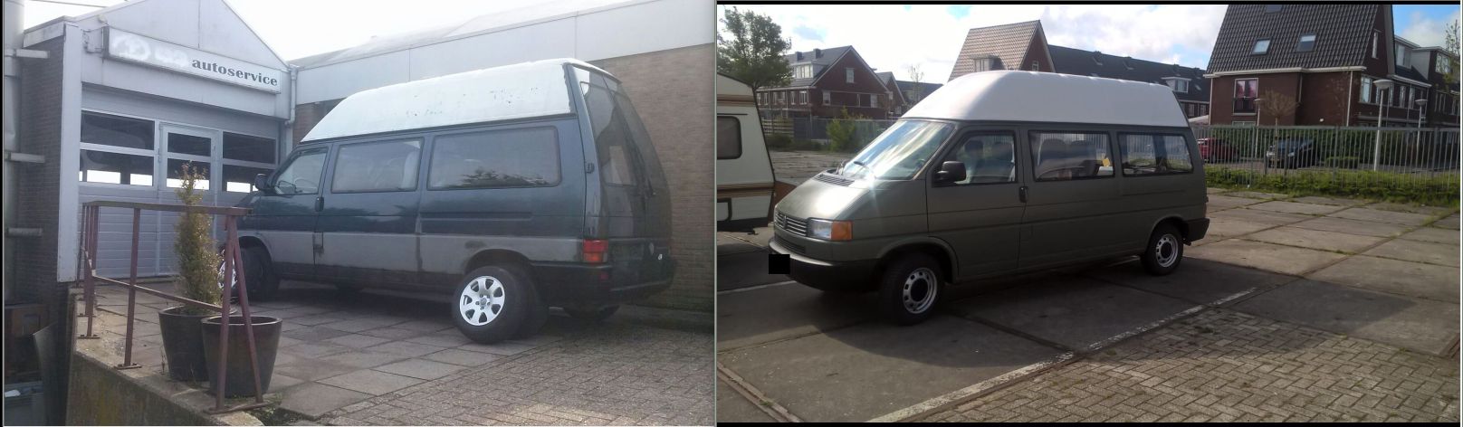 De 2de lak laag en close up. Boven zie je dat de originele blanke lak laag voor een deel weg is. Als je het helemaal strak zou willen maken moet je aan de gang met plamuur enzo. Maar omdat het een bus is die ook naar een festival of ander evenement zal gaan zie ik er geen brood in om hieraan uren te spenderen. Snel de schilders tape weghalen en de laatste puntjes bijwerken. Al met al een wereld van verschil.