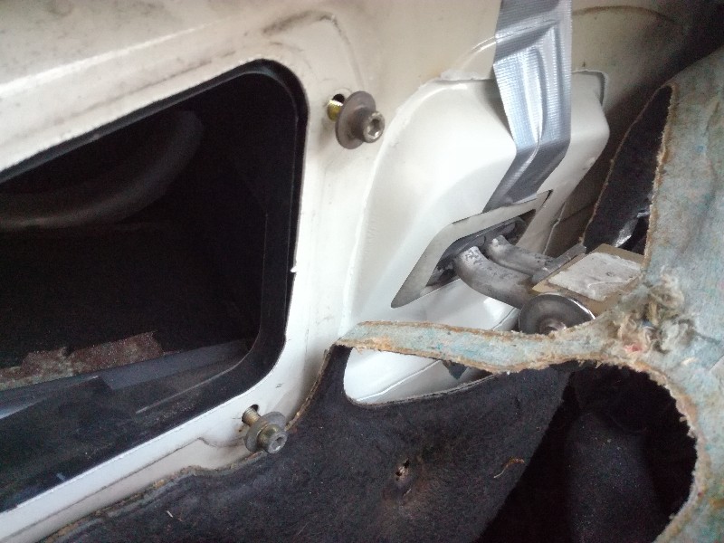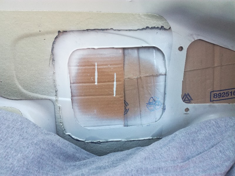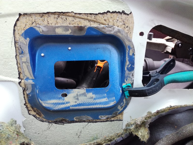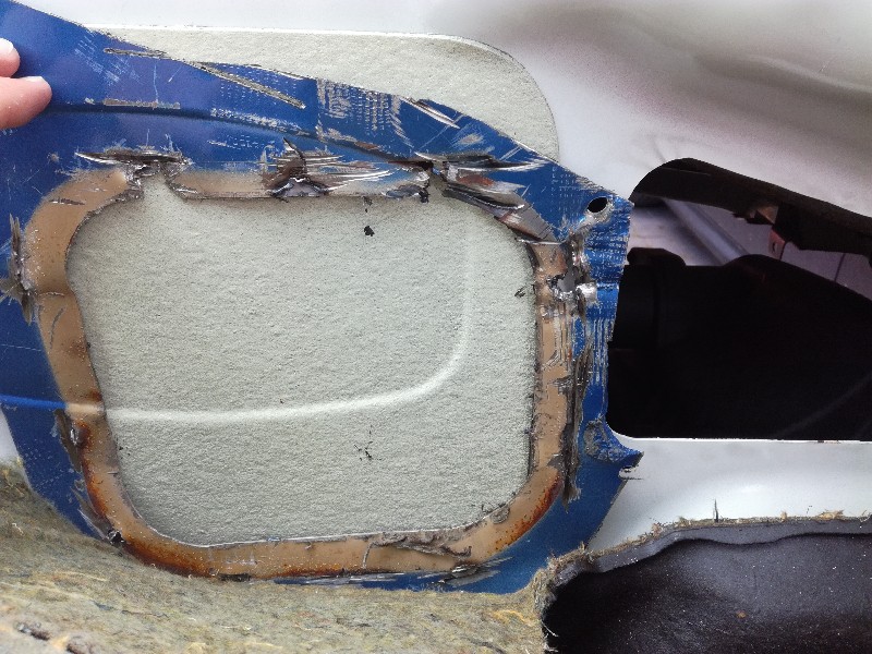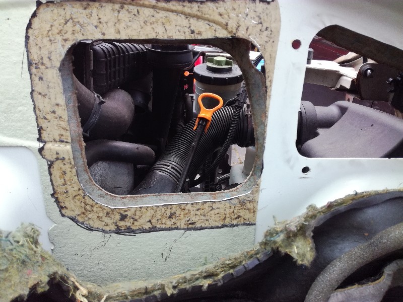 Weer wat verder... Dit is het stuk schutbord waar de doorvoer opzit die in mijn bus moet komen. Het scheiden van beide delen was nog een best klusje, de doorvoer zit met carrosseriekit vast en is ook nog deels gelast. Met hulp van haakse slijper, verfbrander en een beitel lukte het.