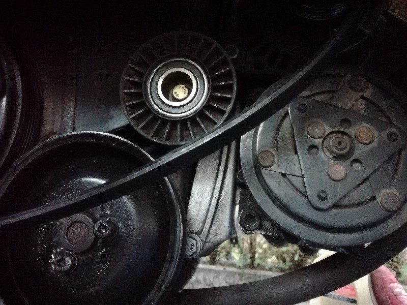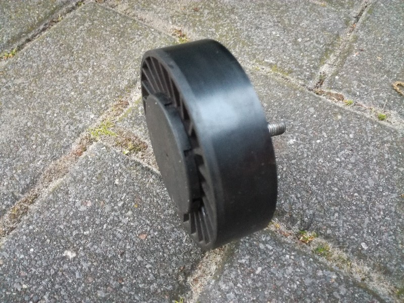 Eerst de poelie die in de weg zit eraf halen. Daar wachtte een "leuke" verrassing: de inbusboutjes van de poelie waren door een voorganger dolgedraaid. Verkeerde bezuinigingen, die boutjes kosten samen nog geen knaak bij de dealer...