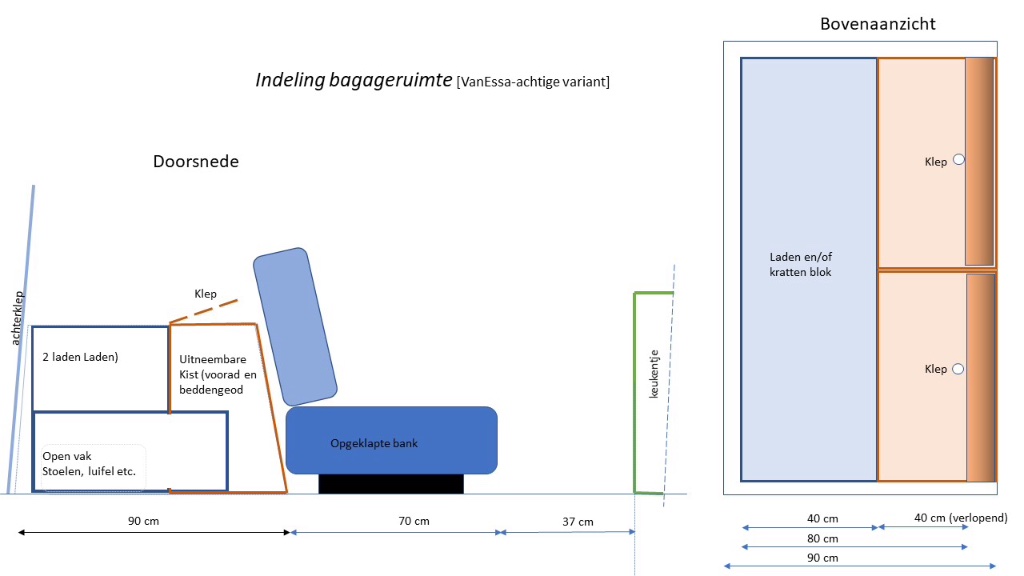 We kozen voor een compromis tussen een gemiddeld grote bagageruimte (op 58 cm hoogte ruim 80 cm lang) met daarbij een redelijke ‘leefruimte’. Tijdens ‘camperen’ is het voorste deel van de bagageruimte vooral bedoeld om er naast misschien wat mondvoorraad etc. overdag ook het beddengoed in te kunnen stoppen. Daartoe is de ruimte dan bereikbaar door een paar kleppen aan de bovenkant.