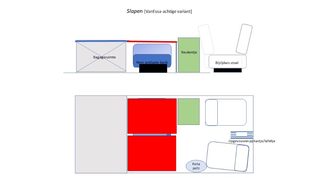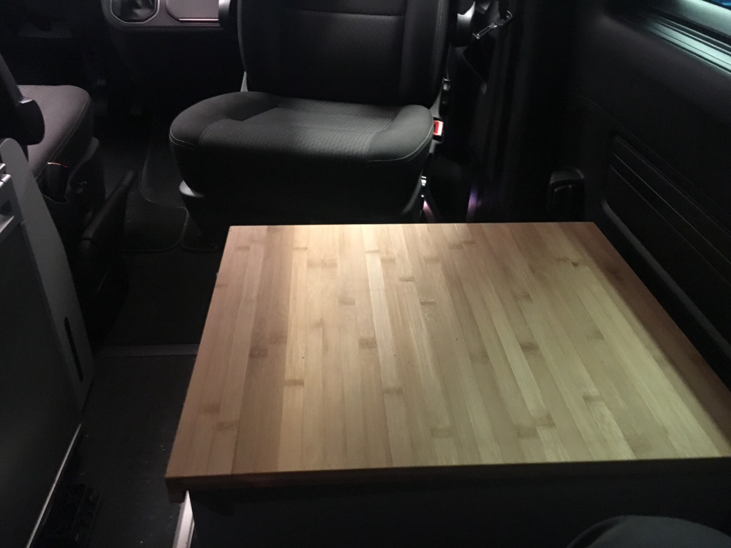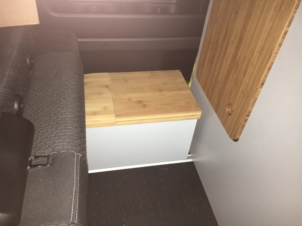 Ik heb al een gecombineerd tafeltje en ombouw voor de porta potti gemaakt. Overdag een keurig tafeltje in stijl van het keukenblokje (dus lichtgrijs met bamboe blad) tussen de bank en de omgedraaide bijrijdersstoel).