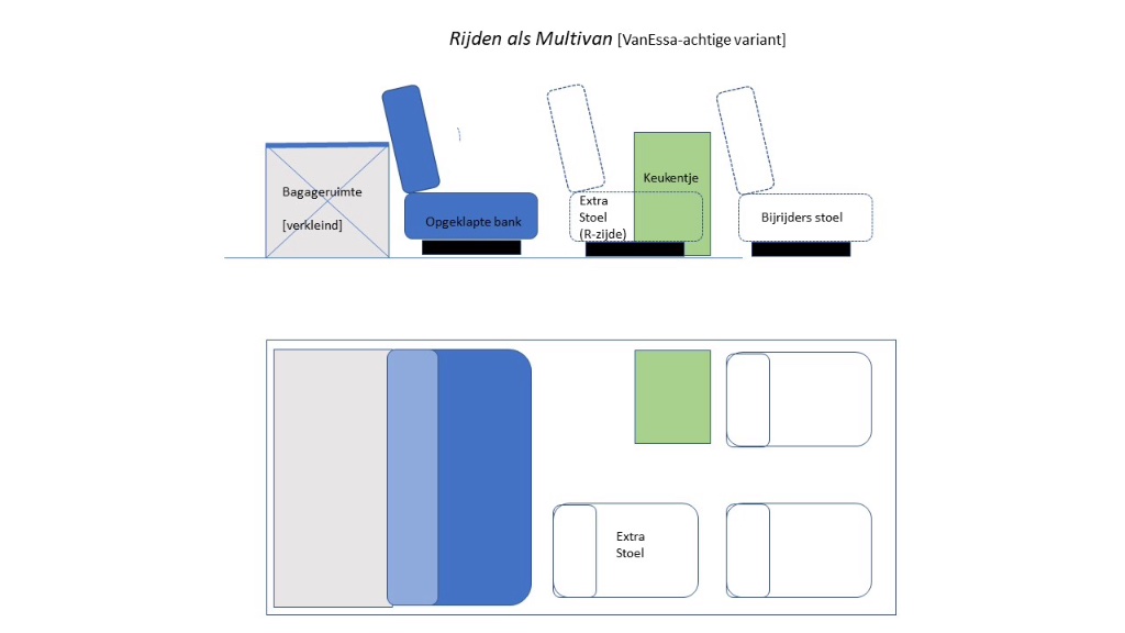 Bij het sporadische gebruik met de extra stoel (de 6e zitplaats) wordt de bagageruimte aanmerkelijk ingekort voor voldoende beenruimte. Dat kan omdat een deel van de ‘hardware’ daar eenvoudig uitneembaar zal zijn.