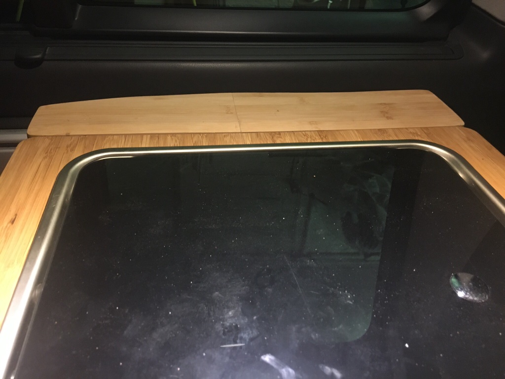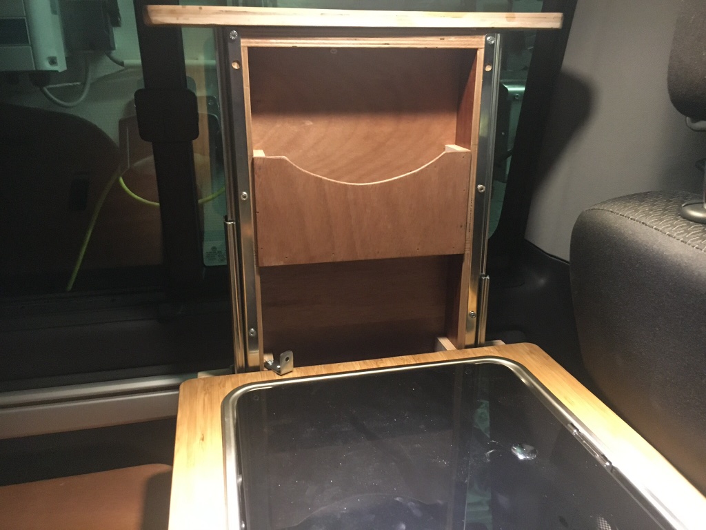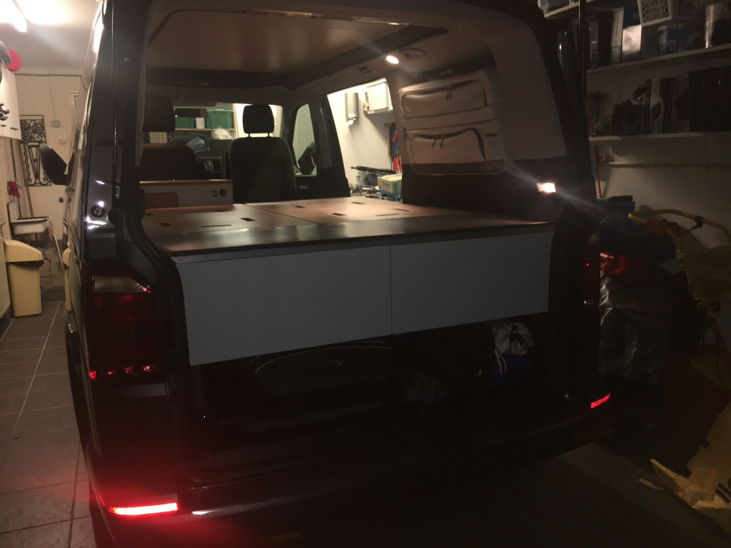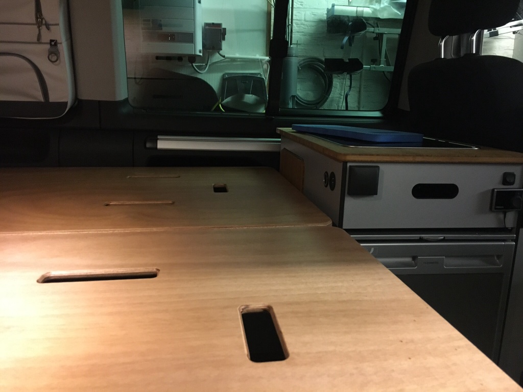 Een beetje houtbewerken is al langer een (soort) hobby van me en ik moet zeggen dat ik het ook een leuke uitdaging vind om dit soort dingetjes te bedenken. In een Multivan is alles van plastic en je moet dus echt op zoek naar kansen om opbergruimte te maken (als je net zoals ik de bus en het plastic niet wilt beschadigen- alles moet in mijn geval zonder schade weer te verwijderen zijn).