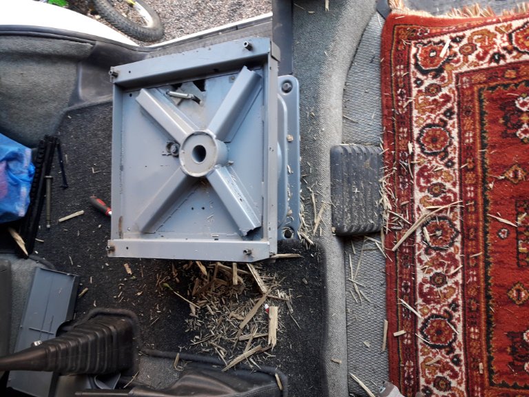 Over omwisselen: de gordel bevestiging zit met een bout vast in een soort pijp, achterop het draaiplateau. Bout komt inderdaad tevoorschijn achter zwarte dopje. Was ook begonnen deze om te zetten, maar helaas, aan de andere kant ( op de foto weer achter een grijze kunststof kap) zit er in die pijp geen schroefdraad. Omwisselen lijkt nog steeds te kunnen daarvoor moet ik bij een werkplaats ergens een bout in die piijp laten lassen, of er een bus met schroefdraad in zetten ofzo. En dat ging net even niet op de camping :)