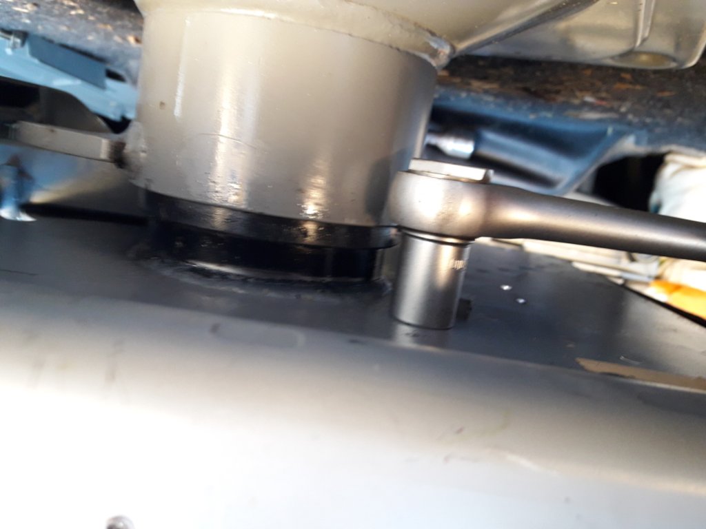 Bovenop, midden in het plateau zie je t gat waar een lange bout doorheen gaat, als een soort centrale as. Ik bedacht me dat ik ver weg in de bus een kruissleutel voor de wielmoeren had die wel zou passen. Gereedschapprobleem opgelost en bout dus zo los. Helaas kwamen boven en onderkant niet van elkaar los zoals gehoopt. Ze draaien dus niet alleen niet meer, ze zaten in alle richtingen muurvast.