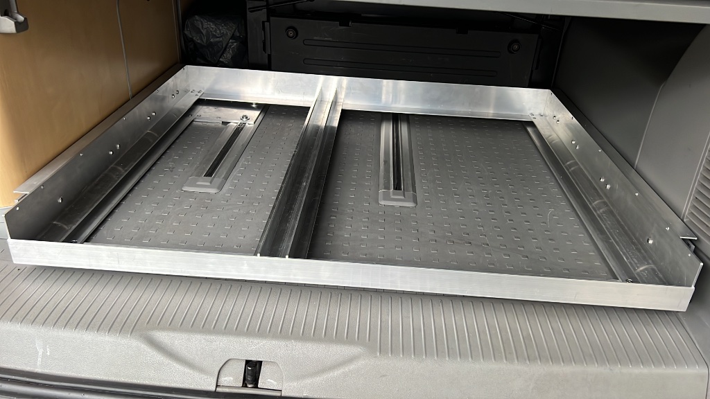 Door de bevestiging aan de rails van de busvloer onder de lade zelf in te passen kan de lade over de bevestigingen heen schuiven en hoeft de bank minder ver naar voren :)