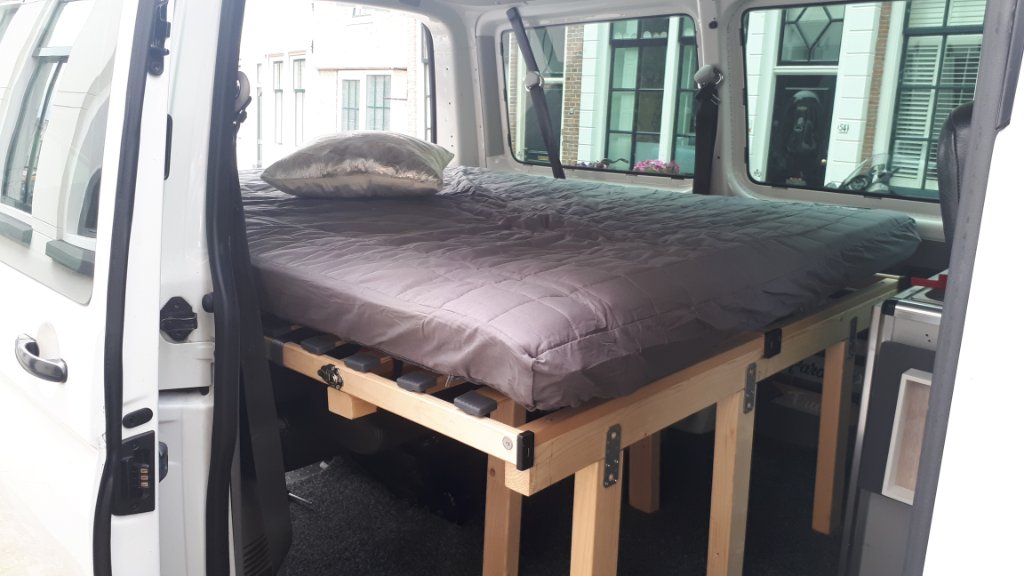 Je kan het ook oplossen door een volwaardige slaapbank te laten monteren , er zijn er incl. gordels en 3 zitplaatsen.