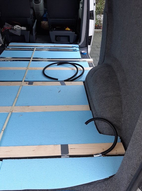 Ik wil graag een houten kastje plaatsen tussen de twee voorstoelen. Voor een thermoskan, Ipad en wat papieren bij de hand te hebben. Kan ik dat ter plekke gewoon aan de bodem vastschroeven met een paar metaal parkers. Er ligt een rubberen mat in en daaronder gewoon de metalen vloer. In de laadruimte heb ik isolatie en een houten vloer gemaakt, maar die ligt dus niet tussen die twee voorstoelen. Ik zal binnenkort weer wat fotootjes uploaden van de laatste werkzaamheden.