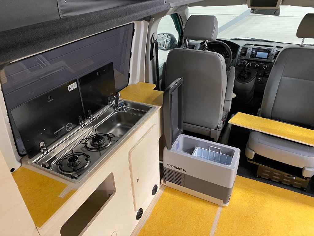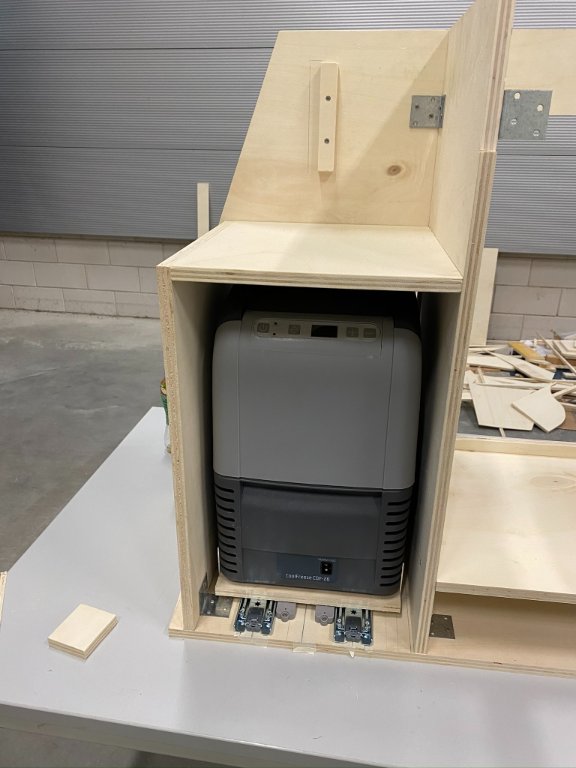 Voor de koelbox hebben we een rails systeem gemaakt zodat je deze uit de kast kunt trekken zodra je wat nodig hebt.