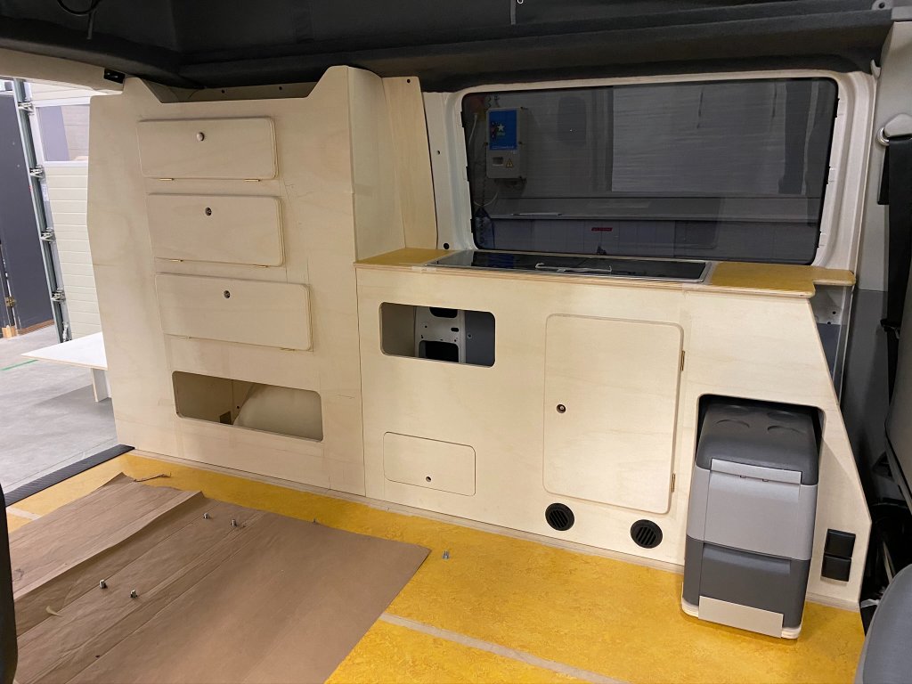 Door dat de webasto al gemonteerd zat, zit in de keukenkast een dubbele bodem voor de webasto. Je ziet de twee ronde zwarte lucht uitstroom openingen. De lucht aanzuig zit in de hoge kast achterin. Het luikje onder in de keukenkast geeft toegang tot de dubbel bodem en tot de webasto.. Niet dat je daardoor veel service mogelijkheden hebt, maar je kunt er nog bij...
