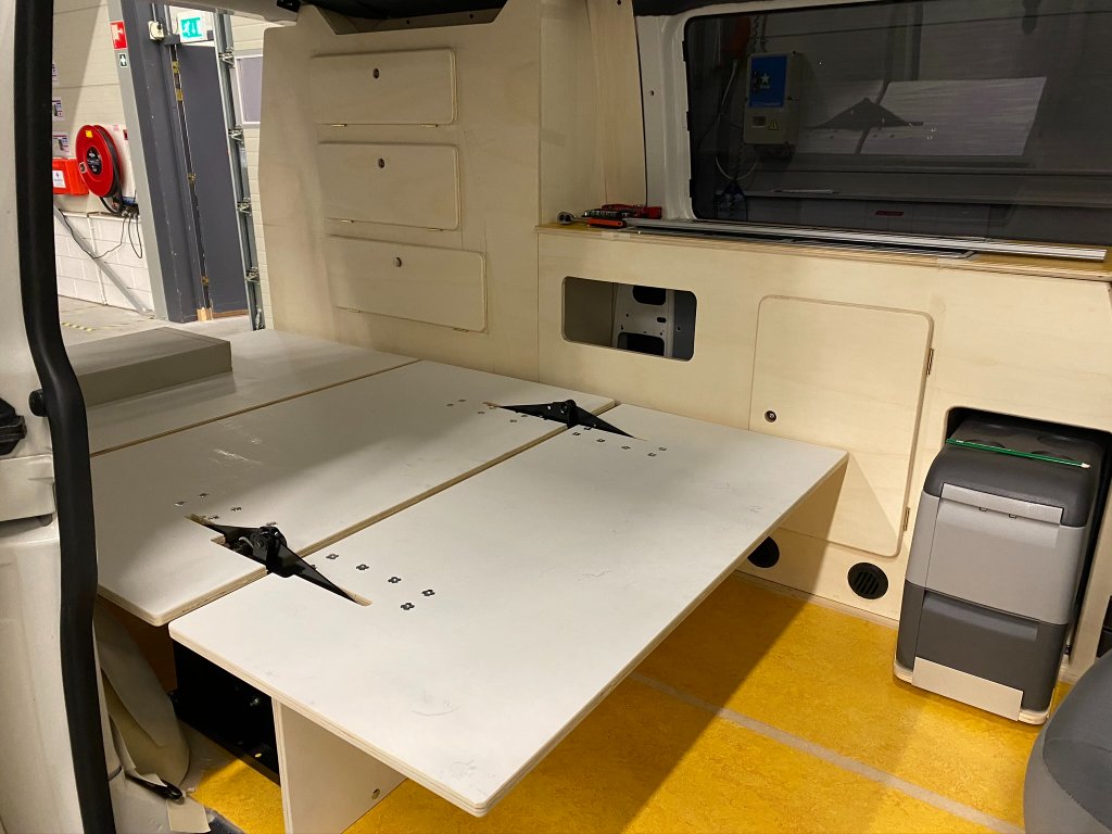 Goed idee om eerst de topvloer buiten de bus te verlijmen en daarna de vloer weer in de bus te leggen!