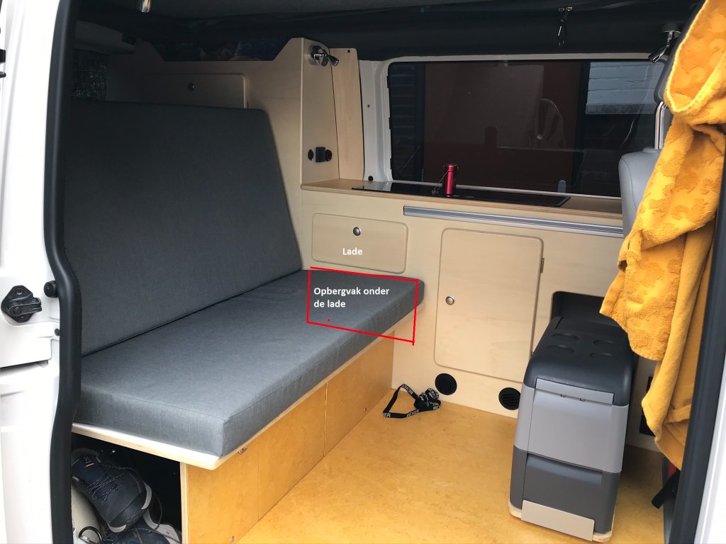Achteraf bleek het opsplitsten van het opberg vak onder de bank een ideale oplossing, want deze ruimte is nu veel bruikbaarder geworden, met en zonder porta potti. Ook vinden we het nu prettig op langere reizen een porta potti bij ons te hebben voor de kleine behoeften... Je hoeft je geen zorgen meer te maken over de overnachtingsplek.. Als er in een volgend project plek voor is, dan bouw ik er zeker weer eentje in.